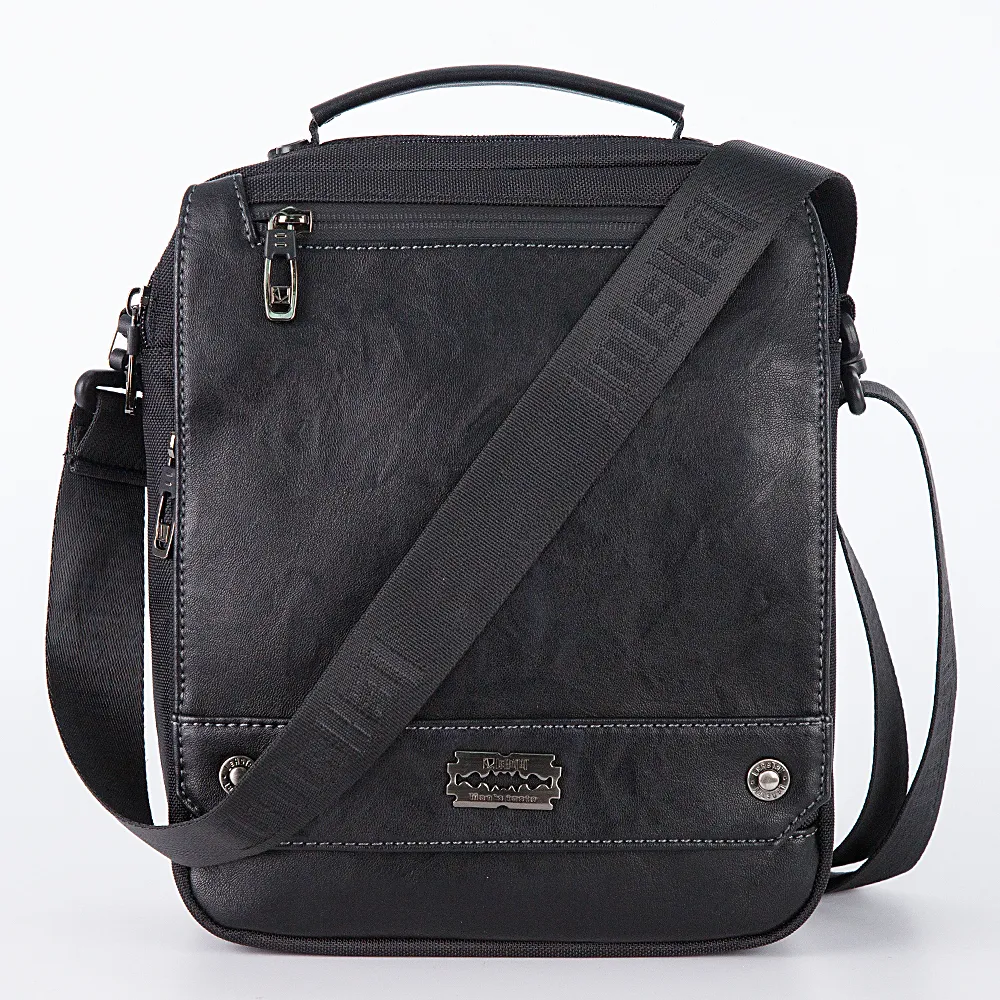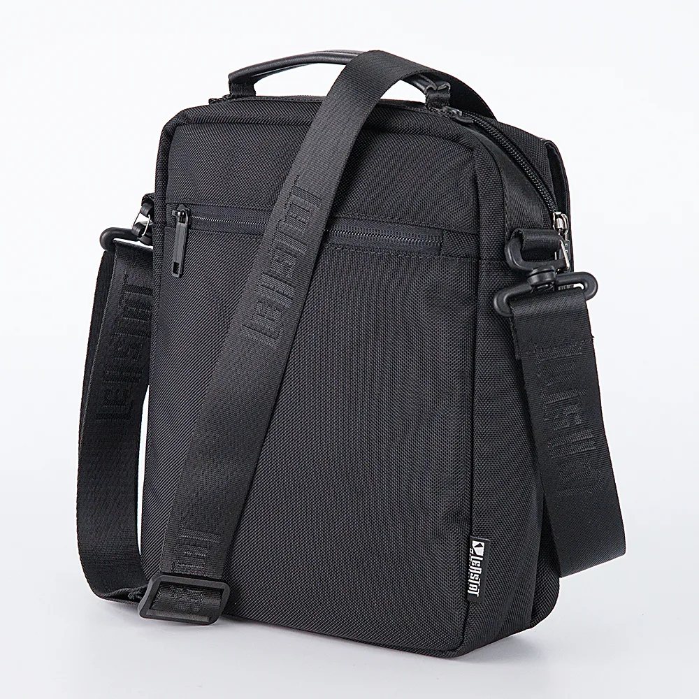 Сумка-планшет от торговой марки Leastat из плотного текстильного материла и искусственной кожи черного цвета. Модель вертикальной ориентации с одной ручкой и несъемным регулируемым плечевым ремнем. Отделение на молнии. Внутри: фирменная подкладка, карман на молнии, органайзер для канцелярских принадлежностей, крепление для ключей. На лицевой стороне – клапан с карманом на молнии, закрывающий накладной карман на молнии и два накладных кармана без застежки. На задней стороне – карман на молнии.