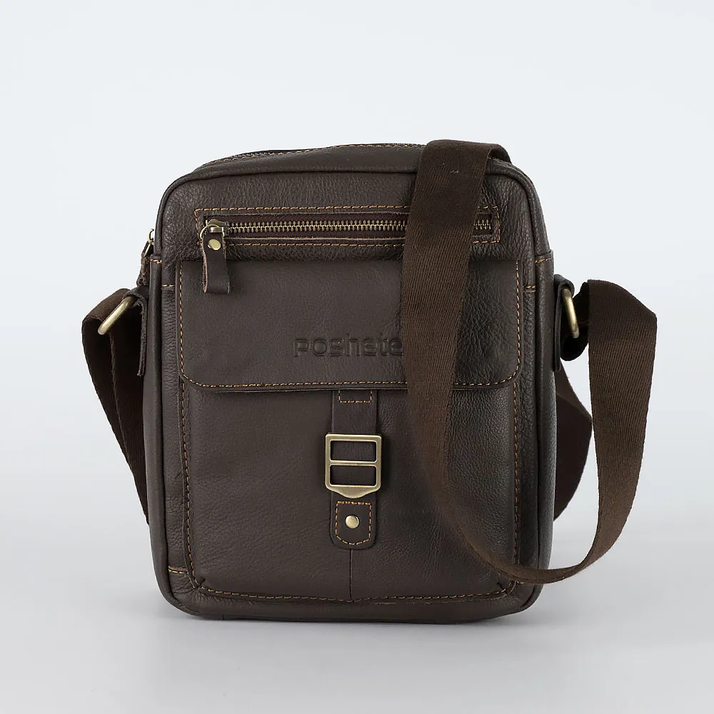 Стильная удобная мужская сумка из натуральной кожи от бренда Poshete. Клапан на лицевой стороне украшает декоративная пряжка приглуш енно-золотистого цвета. На лицевой и задней сторонах есть прорезные карманы на молниях. Под клапаном еще один вместительный карман. Внутренняя часть отделана плотной брендированной подкладкой. Сумка носится через плечо на регулируемом плечевом ремне из текстиля. Цвет модели - темно-коричневый.