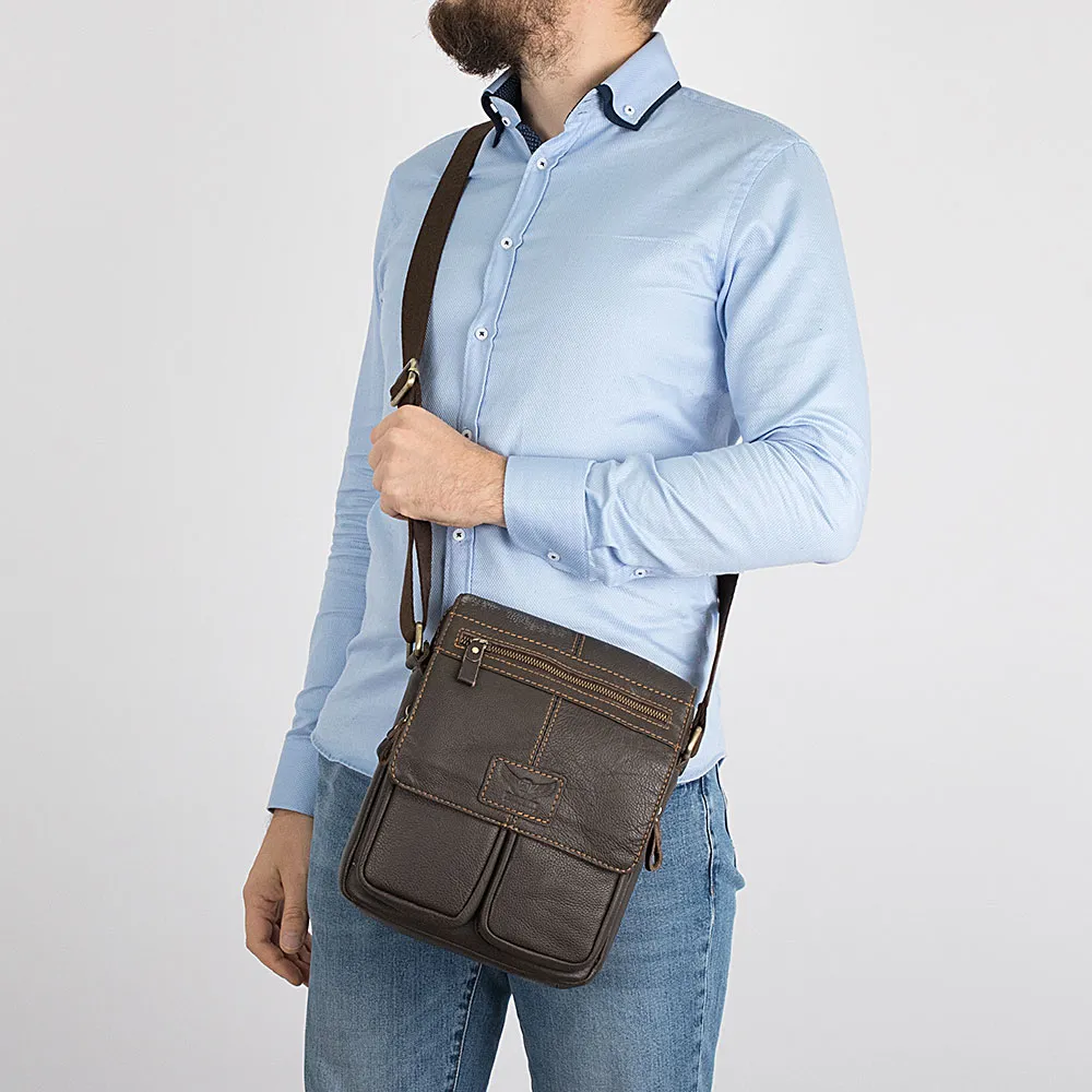 Мужская сумка-планшет из натуральной мягкой кожи коричневого оттенка от бренда Poshete. Сверху закрывается клапаном, с прорезным кар маном на молнии. Украшают модель крупная строчка и гравировка фирменного логотипа. Под клапаном два вместительных накладных кармана удлиненной формы и дополнительные прорезные карманы. Также есть карман на обратной стороне аксессуара. Внутри одно основное отделение, два кармана для мелких вещей и один прорезной карман на молнии. Сумка носится через плечо на регулируемом текстильном ремне.