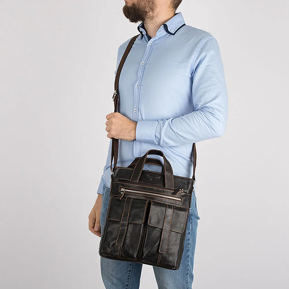 Повседневная мужская сумка от бренда Poshete коричневого цвета, с отличным качеством отделки, выполнена из натуральной кожи в сочетании с металлической фурнитурой. Хорошо подходит для планшета. Сумка на регулируемом ремне через плечо из холстяной ткани и двумя ручками для переноски. Снаружи четыре кармана. Основное отделение на молнии, внутри текстильная подкладка и специализированные карманы.