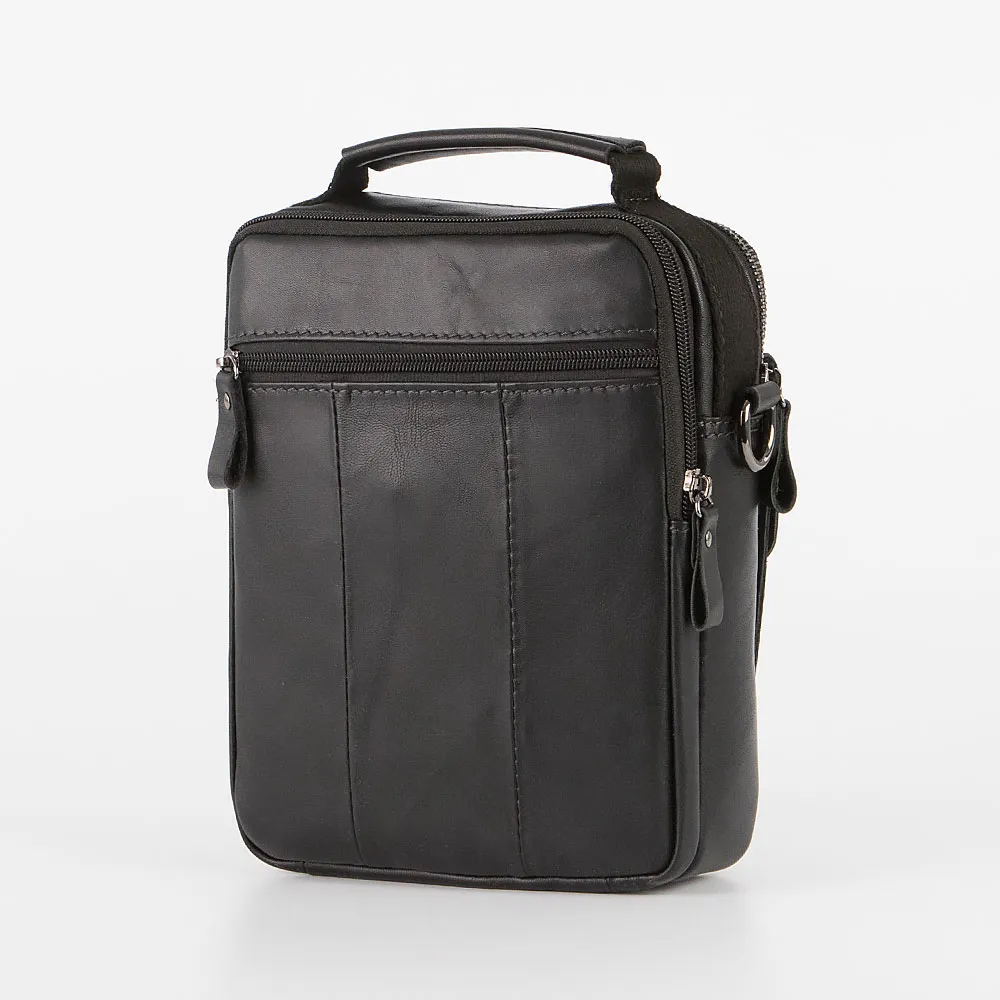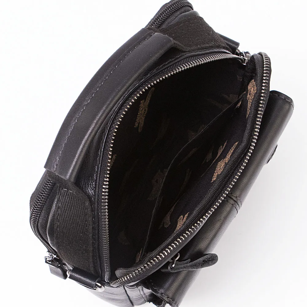 Сумка от торговой марки Poshete из натуральной кожи черного цвета. Модель с одной ручкой и съемным регулируемым плечевым ремнем. Два отделения на молнии, с фирменной подкладкой. В переднем отделении – накладной карман, в задней – карман на молнии. На лицевой стороне, карман на молнии, накладной карман с клапаном на двух магнитных кнопках. На задней стороне – карман на молнии.