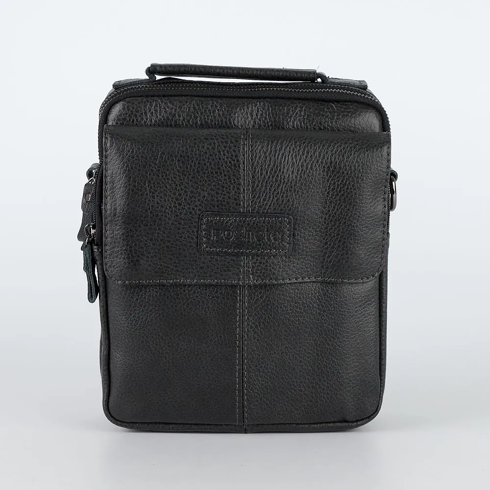 Сумка от торговой марки Poshete из натуральной кожи черного цвета. Компактная модель с одной ручкой и несъемным регулируемым плечевым ремнем, выполненным из текстильного материала. Два отделения на молнии, с фирменной подкладкой. В основном отделении – карман на молнии; в среднем – два накладных кармана. На лицевой стороне карман на молнии, накладной карман без застежки, которые закрываются клапаном на двух магнитных кнопках. На задней – карман на молнии.