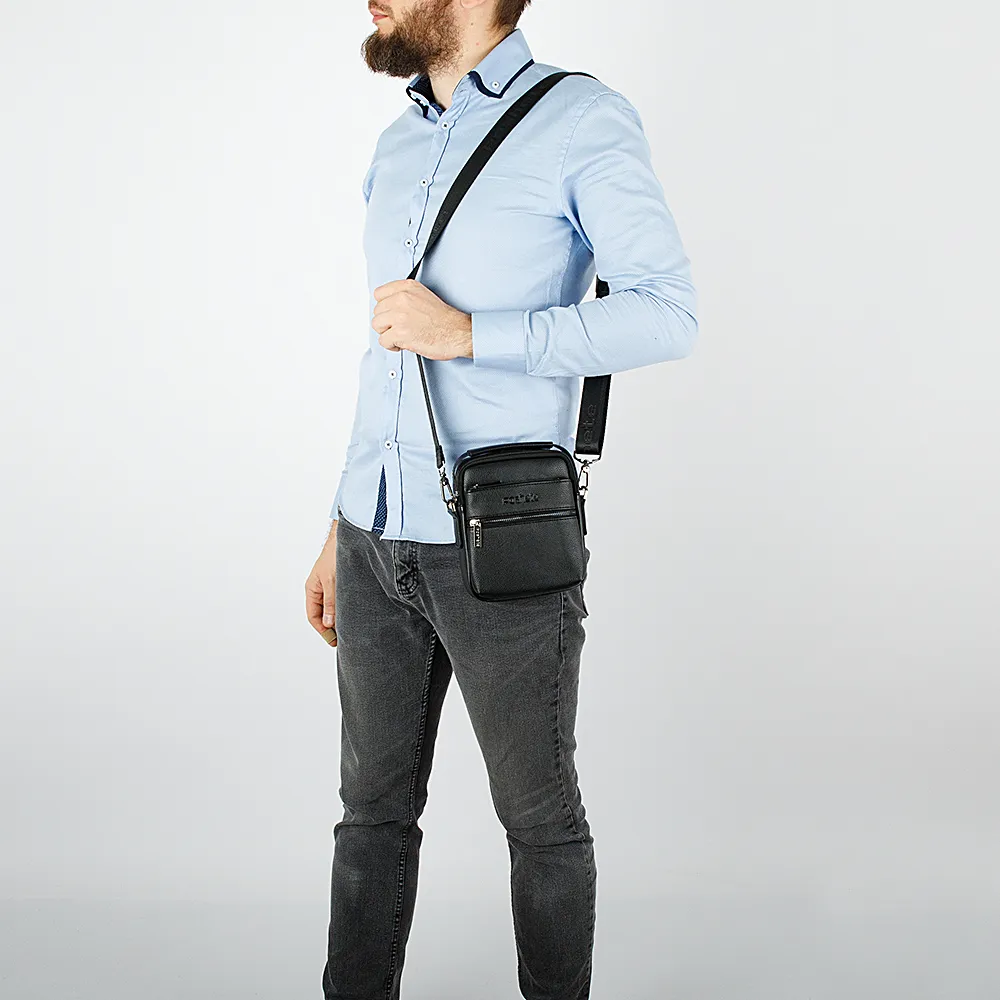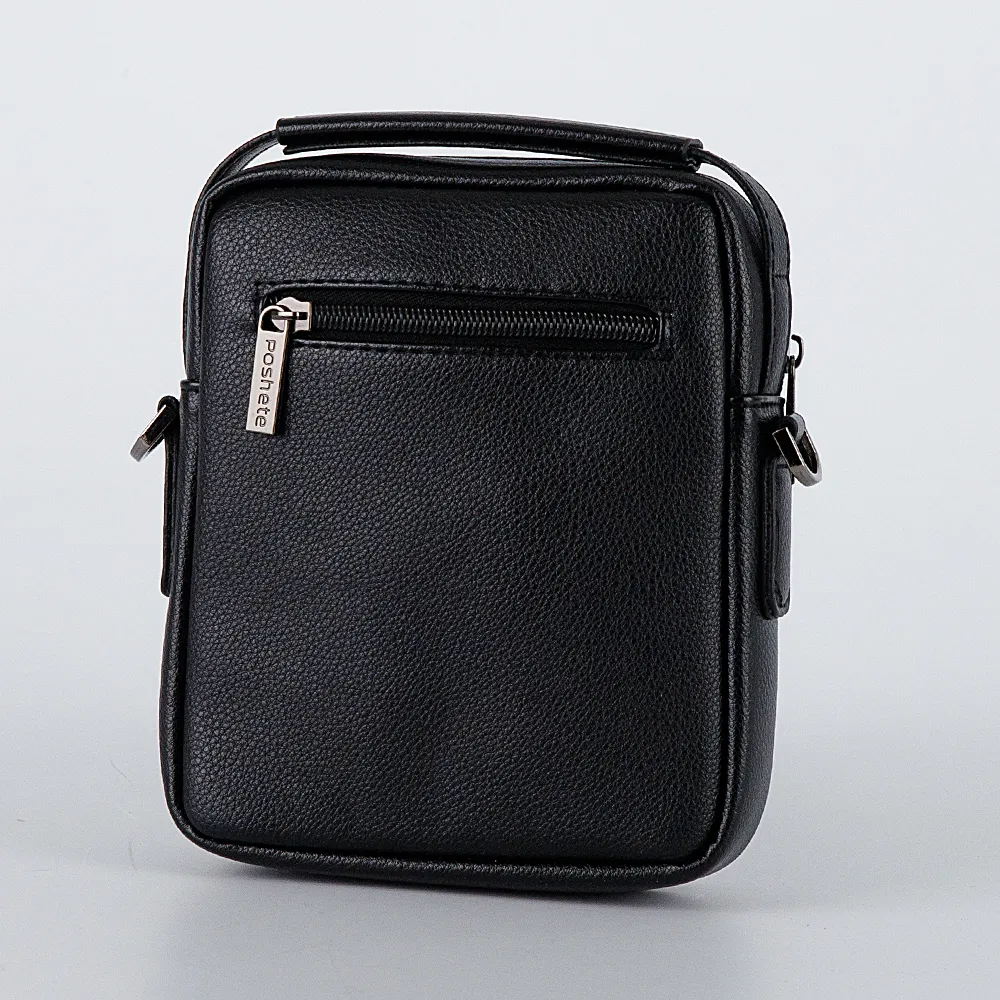Маленькая мужская сумка на каждый день от бренда Poshete выполнена из мягкой искусственной кожи, с отличным качеством отделки. Сумка чёрного цвета, на съёмном текстильном ремне, который регулируется по длине. Оснащена эргономичной ручкой, которая повторяет мягкий контур сумки. Сзади прорезной карман на молнии, спереди два накладных на молниях. Основное отделение на молнии, внутри два дополнительных кармана. Самые необходимые вещи всегда будут под рукой.