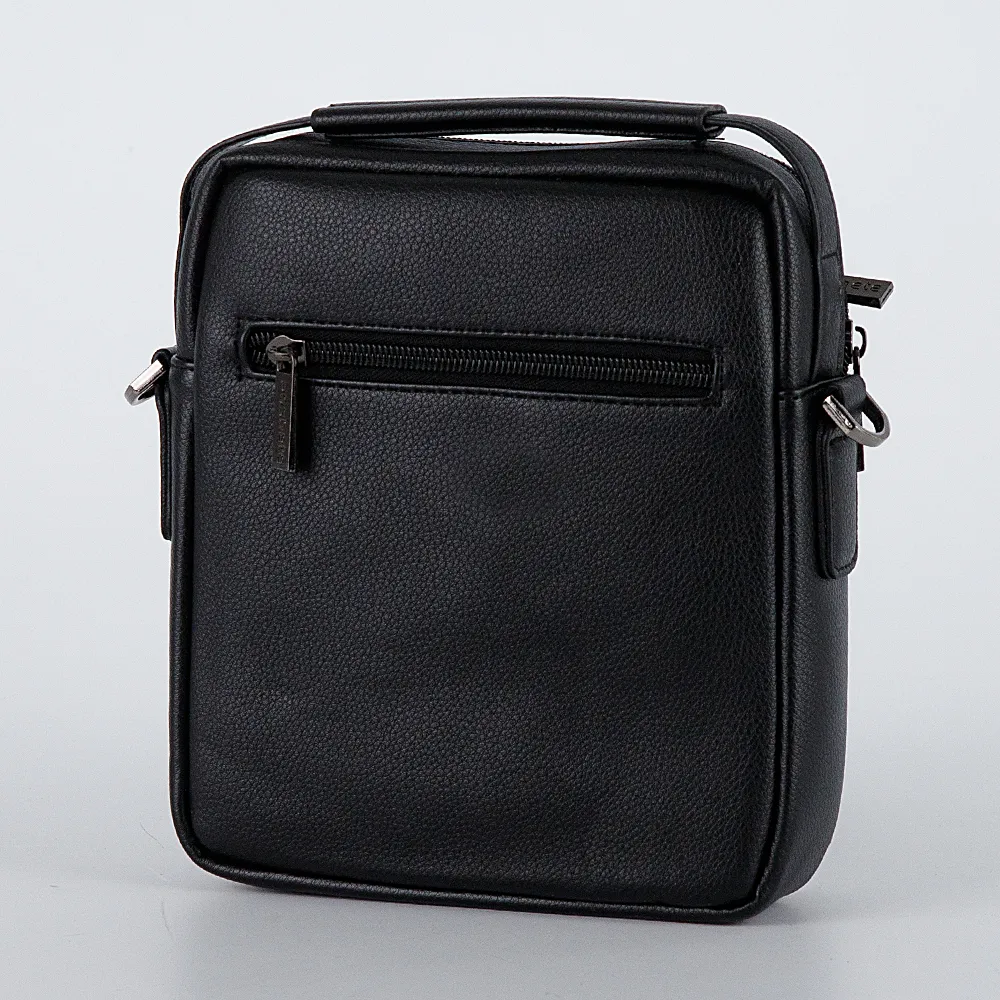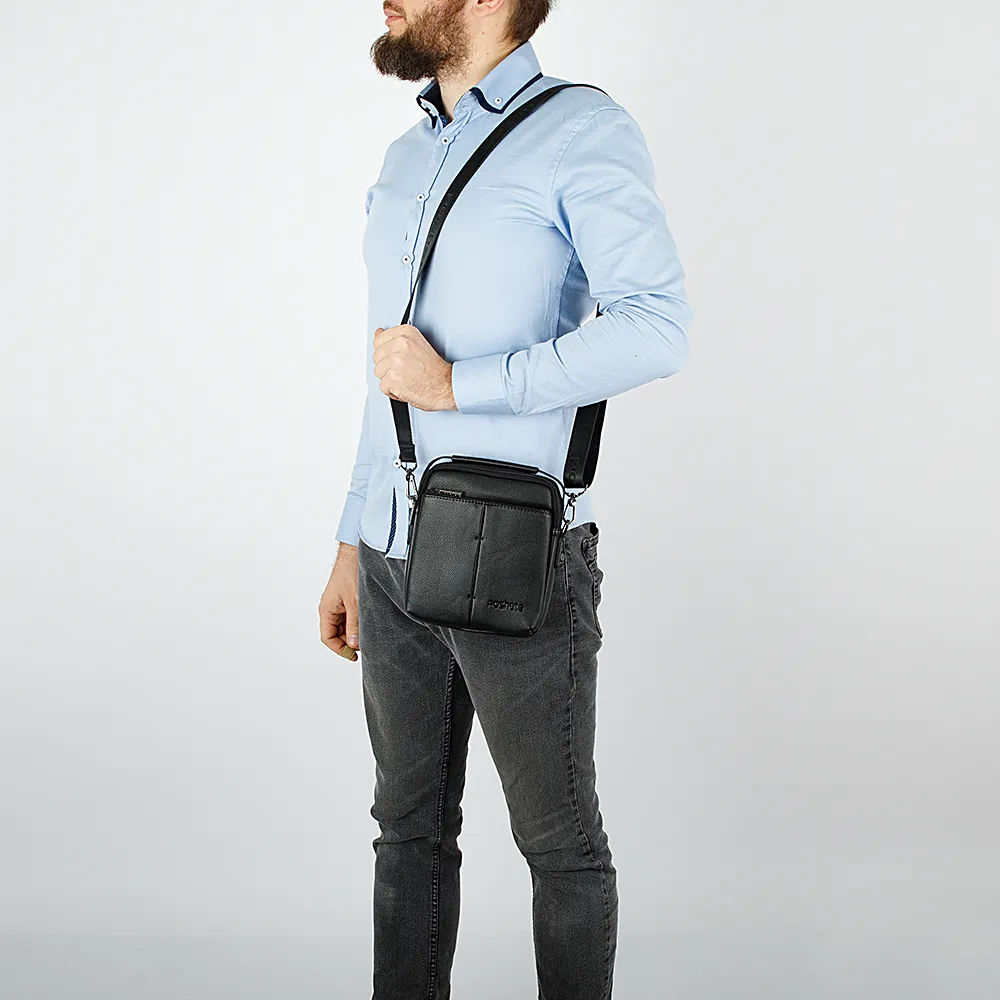 Повседневная мужская сумка Poshete выполнена в чёрном цвете из искусственной кожи с текстильной подкладкой и металлической фурнитурой. Имеет одну ручку для переноски и один плечевой ремень из текстиля. Тип застёжки - молния. Снаружи два кармана на молниях, спереди и сзади.
