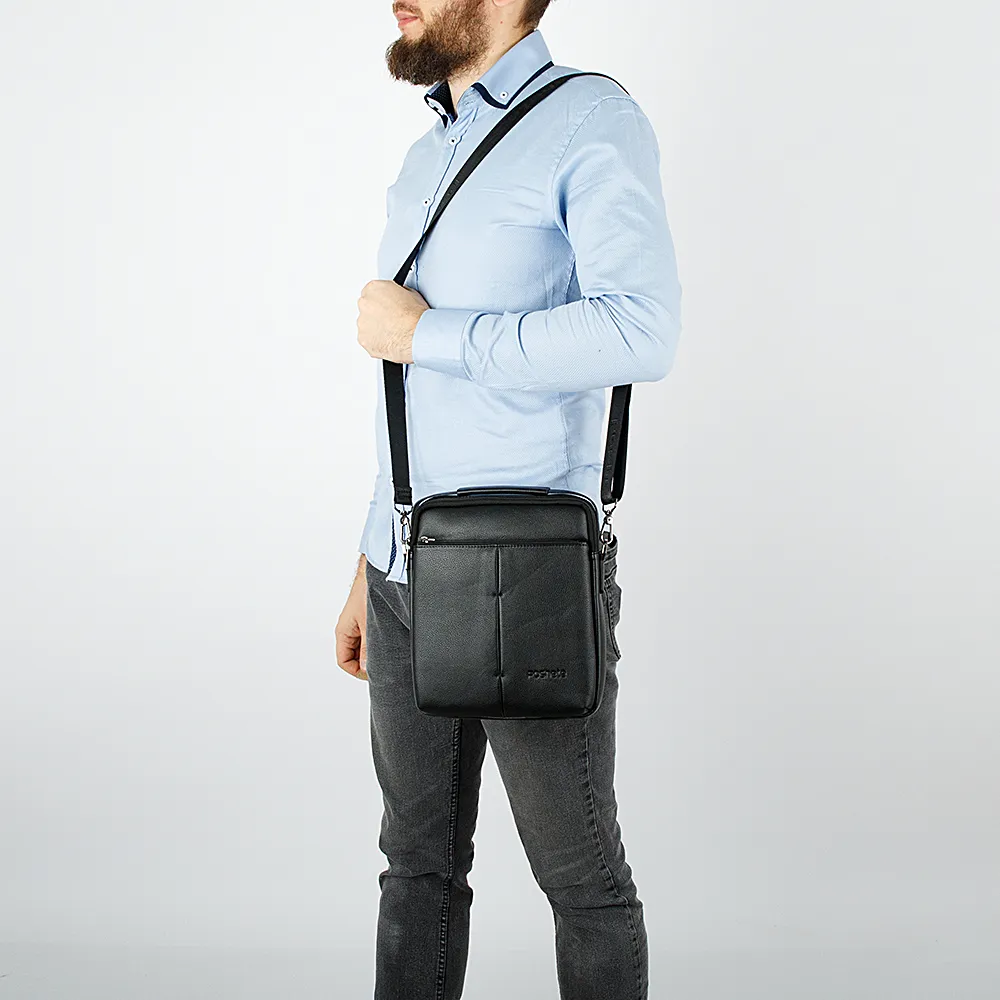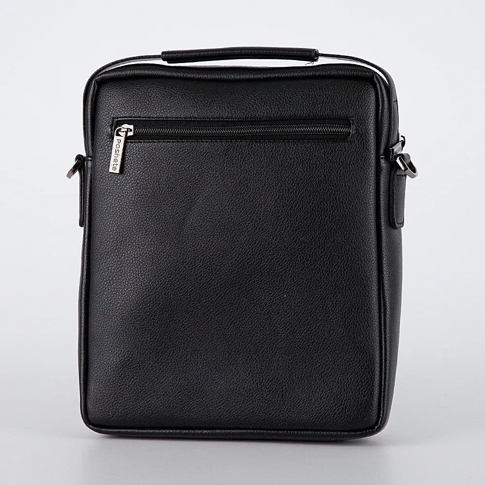 Повседневная мужская сумка Poshete выполнена в чёрном цвете из искусственной кожи с текстильной подкладкой и металлической фурнитурой. Имеет одну ручку для переноски и один плечевой ремень из текстиля. Тип застёжки - молния. Снаружи два кармана на молниях, спереди и сзади.
