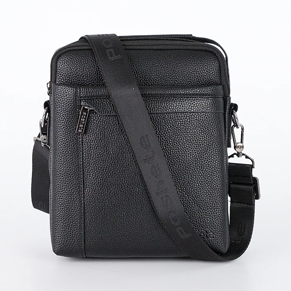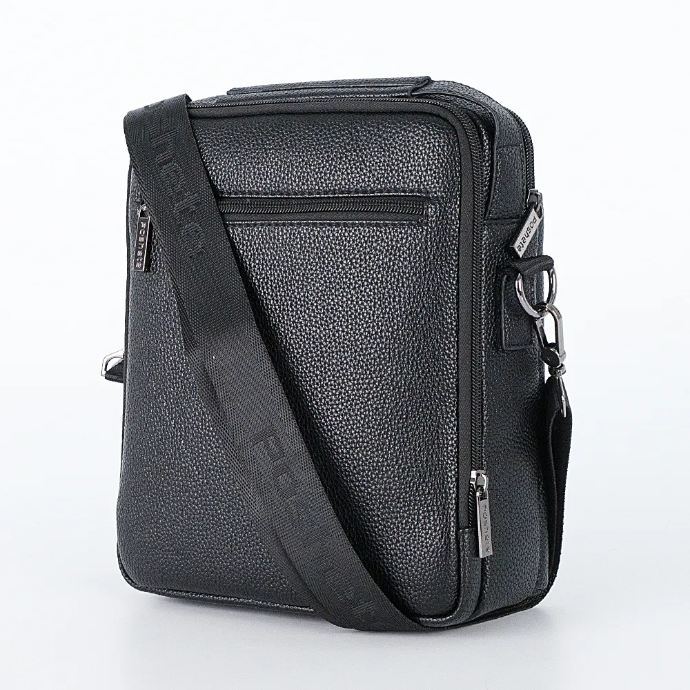 Сумка-планшет от торговой марки Poshete из искусственной зернистой кожи черного цвета. Модель вертикальной ориентации со съемным регулируемым плечевым ремнем, выполненным из текстильного материала. Два отделения на молнии с фирменной подкладкой. Заднее отделение широко раскрывается благодаря молнии по трем сторонам; внутри: карман на молнии, накладной карман. На лицевой стороне – карман на скрытой молнии. На задней – карман на молнии.