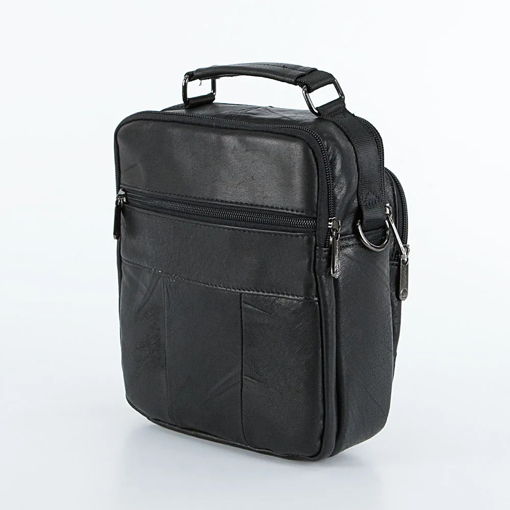 Сумка от торговой марки Poshete из натуральной кожи черного цвета. Модель среднего размера вертикальной ориентации с одной ручкой и съемным регулируемым плечевым ремнем из текстильного материала. Два отделения на молнии с фирменной подкладкой; в одном из них – карман на молнии. На лицевой стороне: накладной и прорезной карманы на молнии. На задней стороне – карман на молнии.