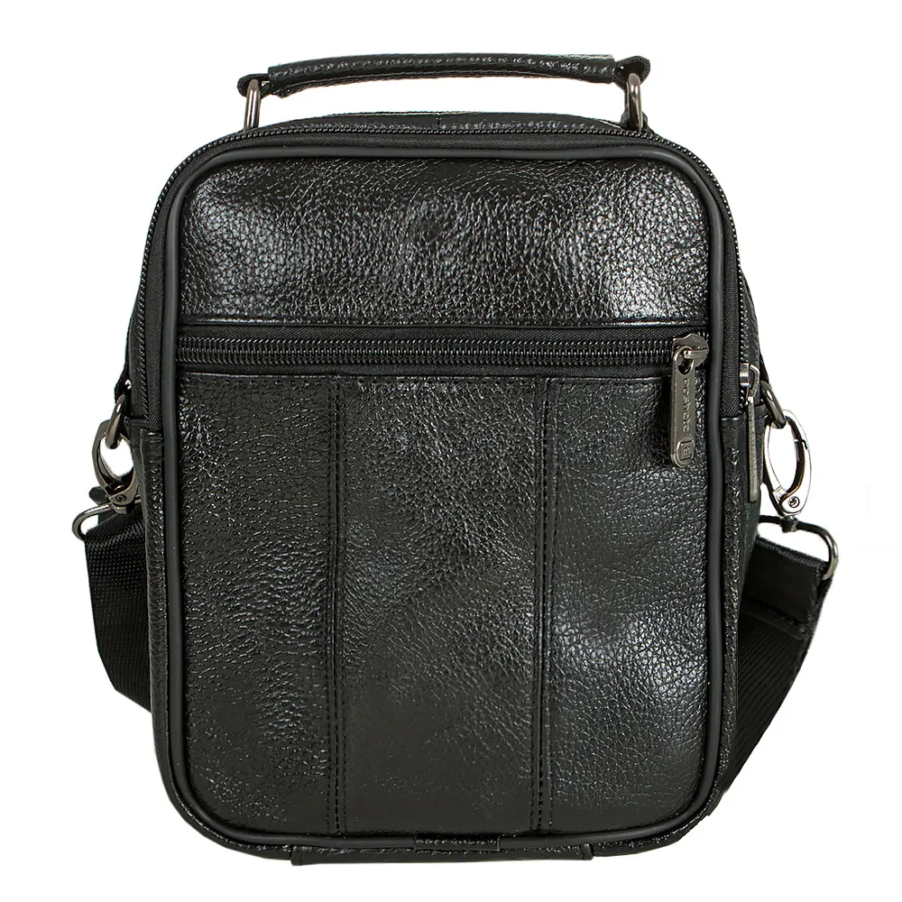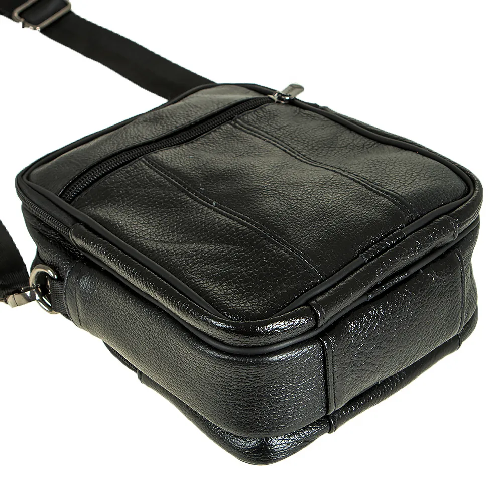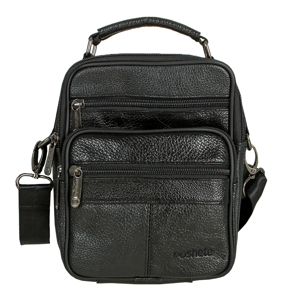 Повседневная мужская сумка от бренда Poshete чёрного цвета, с отличным качеством отделки, выполнена из натуральной кожи в сочетании с металлической фурнитурой. Авто документы, ключи и бумажник всегда будут под рукой. Сумка небольшого размера, на съёмном атласном ремне, который регулируется по длине и с эргономичной ручкой. Снаружи пять карманов на молниях, два сзади и три спереди. Основное отделение также на молнии, внутри текстильная подкладка.