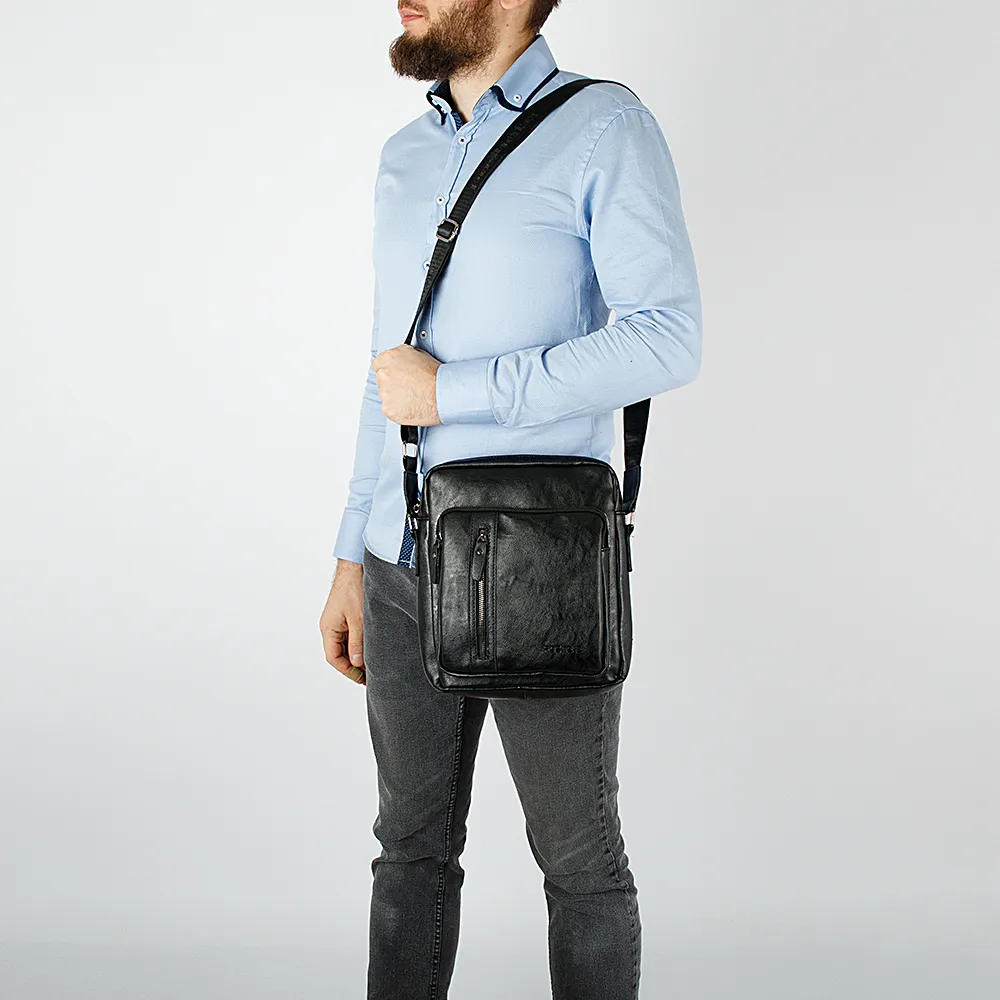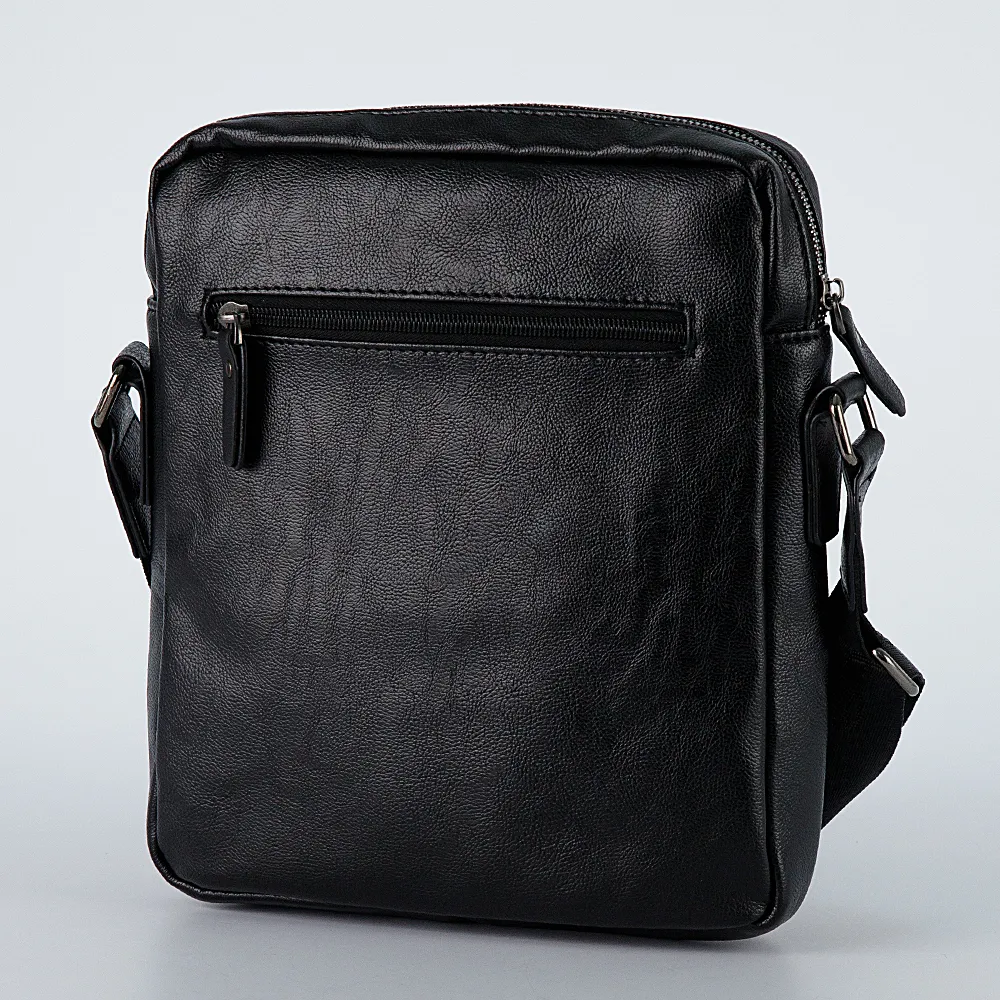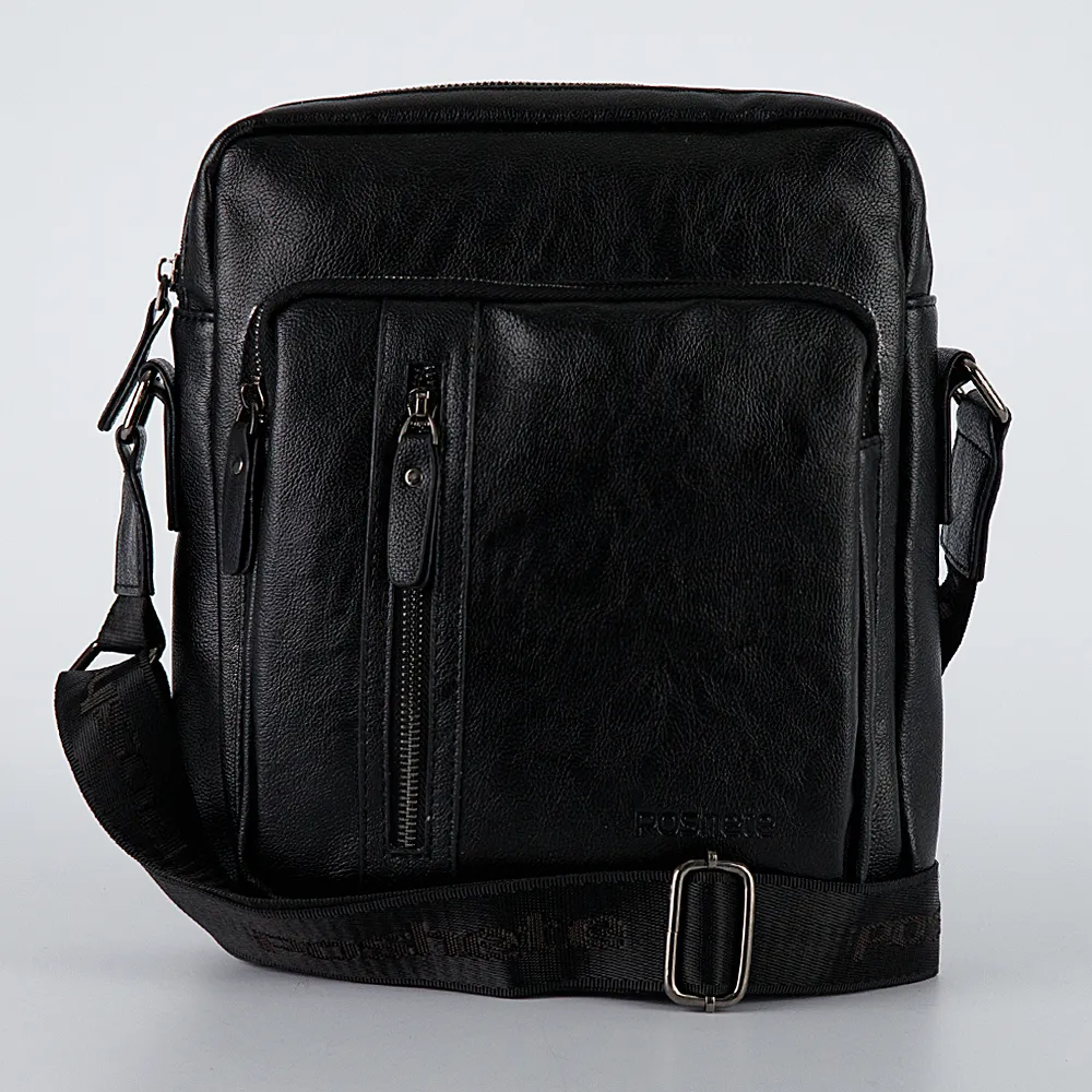 Повседневная мужская сумка Poshete выполнена из искусственной кожи. Модель чёрного цвета, вертикальной прямоугольной формы. Носится через плечо на регулируемом текстильном ремне. Сзади карман на молнии, спереди накладной карман на молнии, а в нём ещё прорезной на вертикальной молнии. Основное отделение на металлической молнии, внутри текстильная отделка и кармашки для мелочей. Практичная и вместительная, хорошо подойдёт для Ipad.