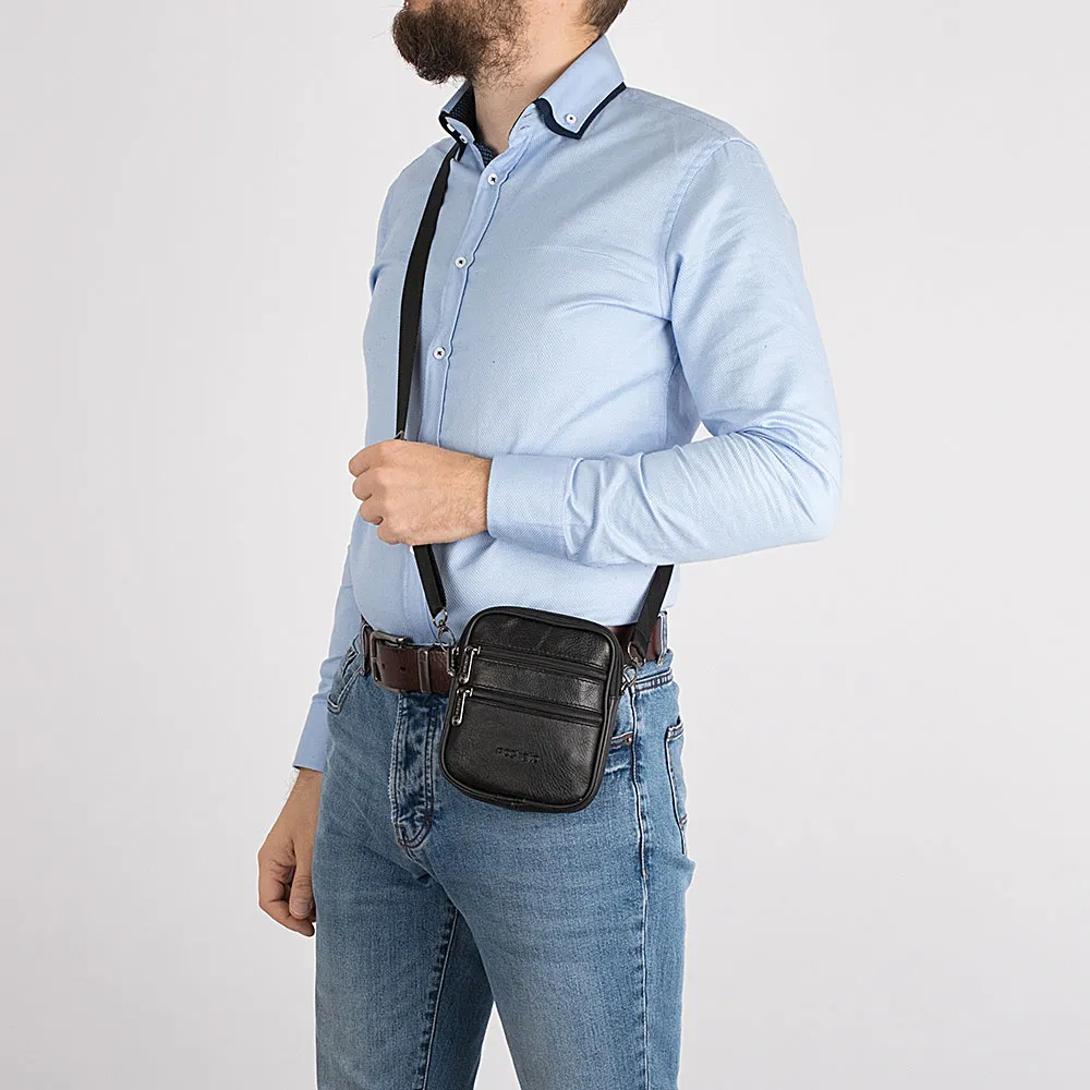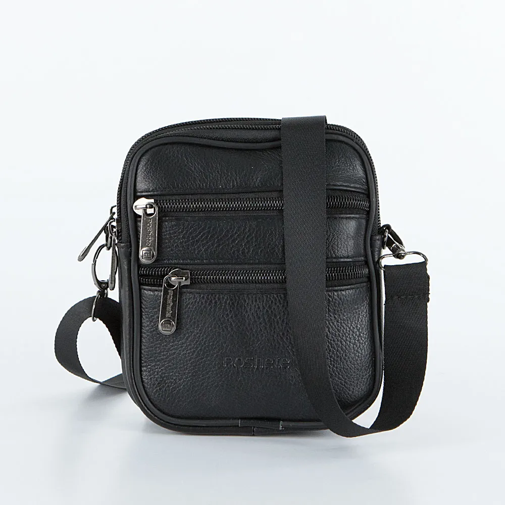 Сумка от торговой марки Poshete из натуральной кожи черного цвета. Компактная модель со съемным регулируемым плечевым ремнем, выполн енным из текстильного материала. Два отделения на молнии с фирменной подкладкой. На лицевой стороне – два кармана на молнии. На задней стороне – шлевка для ношения сумки на поясном ремне.