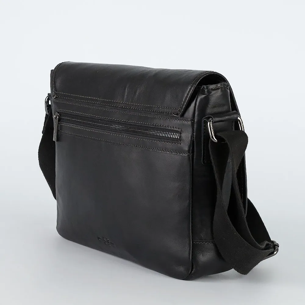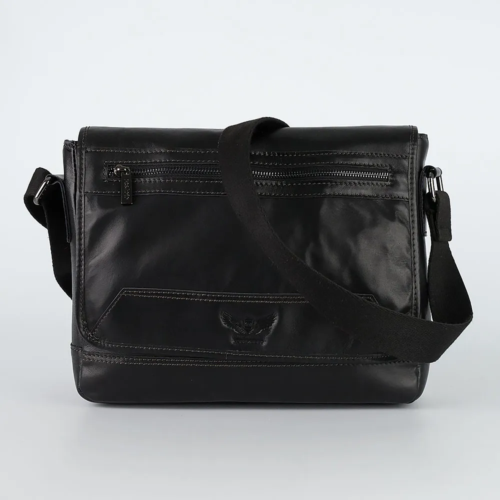 Деловая мужская сумка Poshete из натуральной кожи черного цвета. Застёгивается на молнию и дополнительно закрывается клапаном на магнит, внутри текстильная подкладка, снаружи два кармана на молниях, носится на регулируемом ремне, из текстильного материала, через плечо.