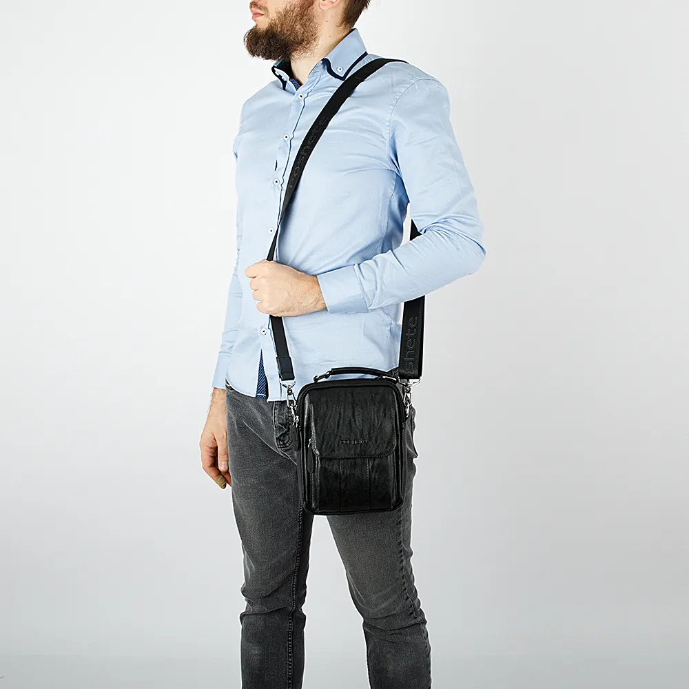 Небольшая мужская сумка Poshete выполнена из искусственной кожи. Модель чёрного цвета, вертикальной прямоугольной формы. Носится через плечо на регулируемом текстильном ремне. Сзади карман на молнии, спереди накладной карман под клапаном на магните. Два основных отделения на молниях, внутри текстильная отделка и карман на молнии. Практичная и повседневная. Плечевой ремень при желании можно отстегнуть, сумка оснащена эргономичной ручкой.