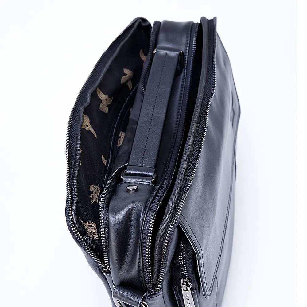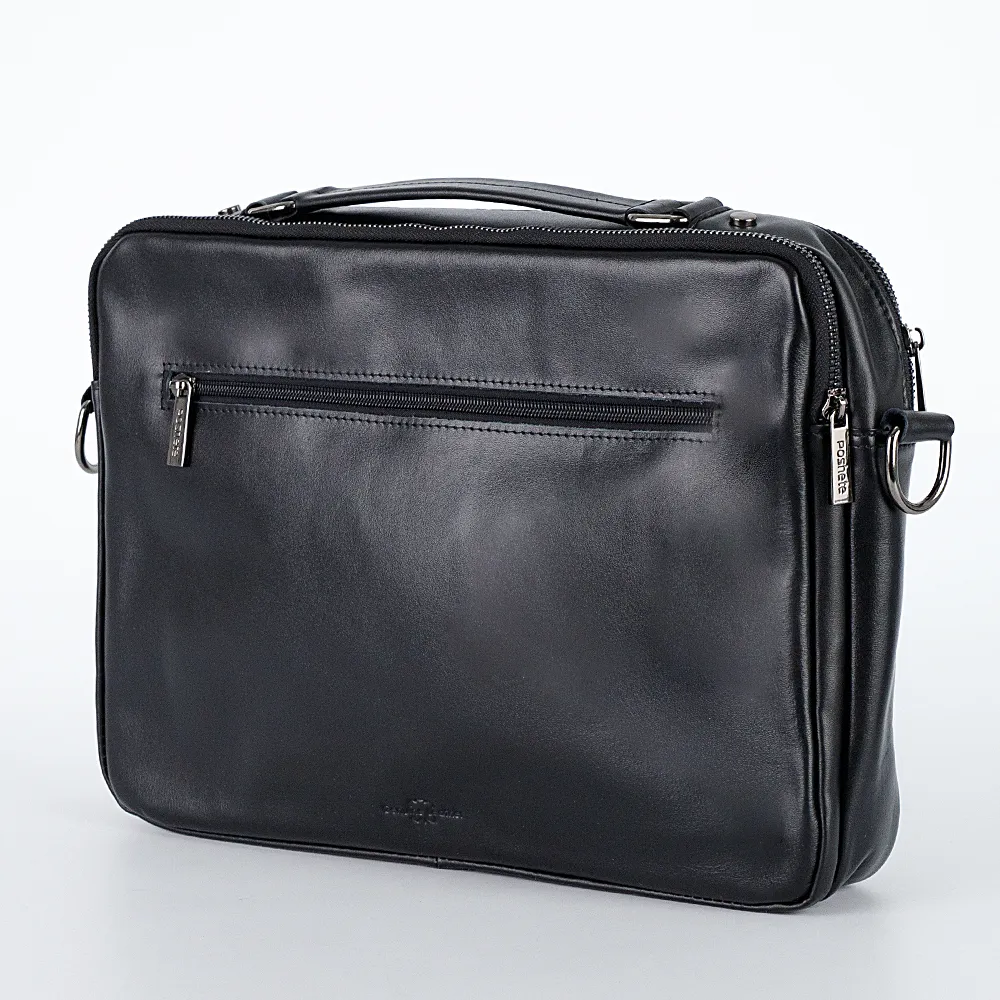 Мужская сумка от торговой марки Poshete выполнена из натуральной кожи черного цвета. Модель с плотной ручкой на кольцах-держателях, со съемным регулируемым плечевым ремнем из текстильного материала. Два отделения на молнии с фирменной подкладкой. В одном из них – карман на молнии, в другом – два накладных кармана. На передней стороне – накладной и прорезной карманы на молнии, которые закрываются клапаном на двух магнитных кнопках. На задней стороне – карман на молнии. Сумка декорирована отстрочкой и тиснением с названием и эмблемой бренда. Размер сумки подойдет для документов формата А4.