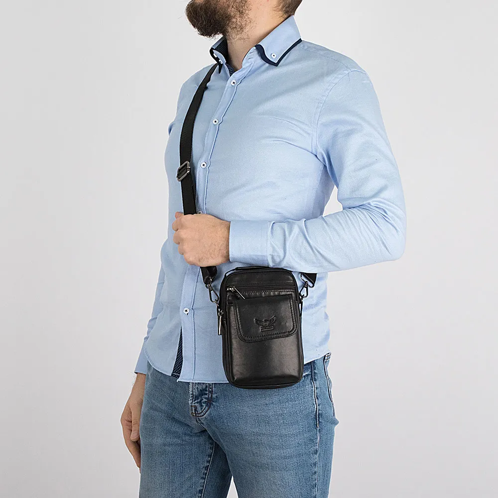 Стильная компактная сумка через плечо от бренда Poshete выполнена из натуральной кожи черного цвета. Модель прямоугольной формы, вертикальной ориентации, с плотной ручкой и съемным регулируемым плечевым ремнем из текстильного материала. Два отделения на молнии, с фирменной подкладкой. В одном из отделений – накладной карман. На лицевой стороне – прорезной карман на молнии, накладной карман с клапаном на двух магнитных кнопках, декорированным тиснением с названием и эмблемой бренда. На задней стороне имеется шлевка для ношения сумки на ремне и карабин для крепления.