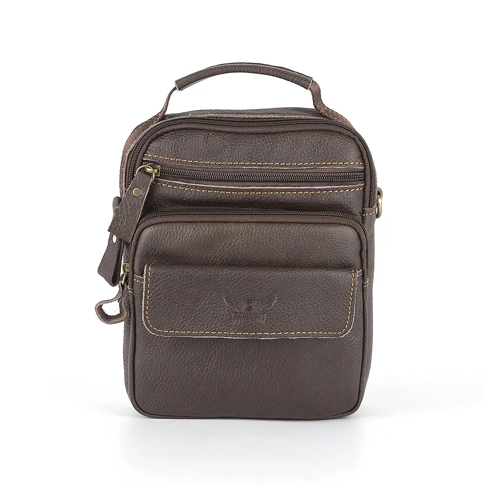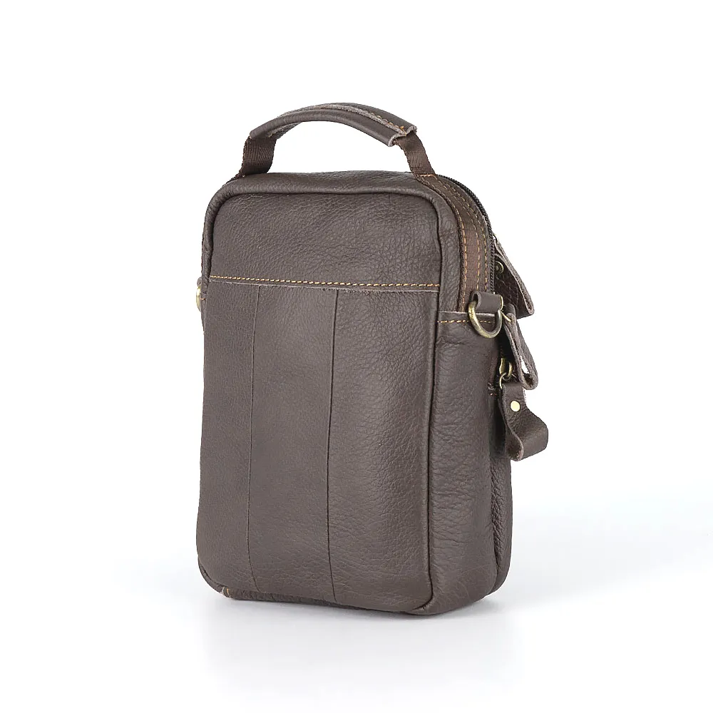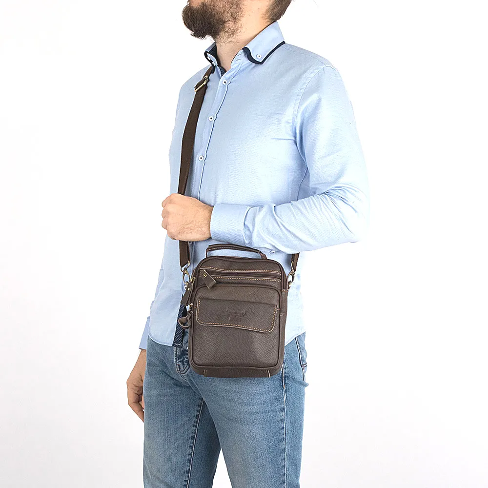 Стильная мужская сумка через плечо от бренда Poshete выполнена из натуральной кожи коричневого цвета. Модель с плотной ручкой-переноской и регулируемым плечевым ремнем. Отделение на молнии, с текстильной подкладкой и карманами. На передней стороне – три кармана: прорезной и накладной – на молнии, а также карман, закрывающийся клапаном на магнитной кнопке. Сумка декорирована фирменным тиснением и отстрочкой.