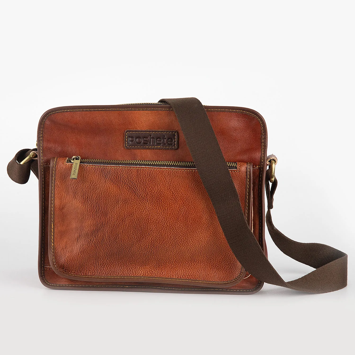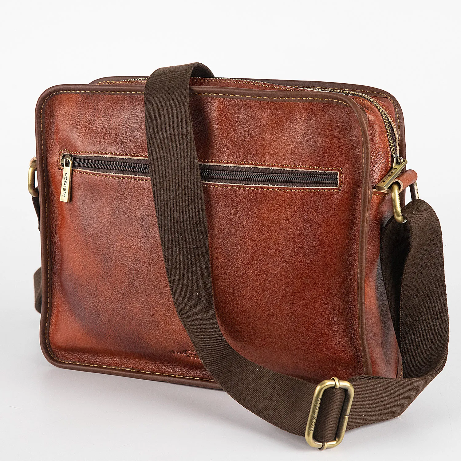 Сумка-планшет от торговой марки Poshete из натуральной кожи коричневого цвета. Модель с регулируемым плечевым ремнем, выполненным из текстильного материала. Отделение на молнии. Внутри: фирменная подкладка, карман на молнии, два накладных кармана. На лицевой стороне – накладной карман на молнии. На задней стороне – карман на молнии.