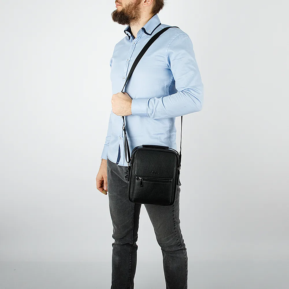 Стильная мужская сумка на каждый день от бренда Poshete с отличным качеством отделки и металлической фурнитурой, выполнена из фактурной искусственной кожи. Самые необходимые вещи всегда будут под рукой. Сумка чёрного цвета, на текстильном ремне, который регулируется по длине и дополнена эргономичной ручкой. Снаружи два прорезных кармана на молниях и один накладной карман под клапаном на двух магнитах. Два независимых отделения на молниях, в одном два дополнительных кармашка, другое предназначено для планшета.