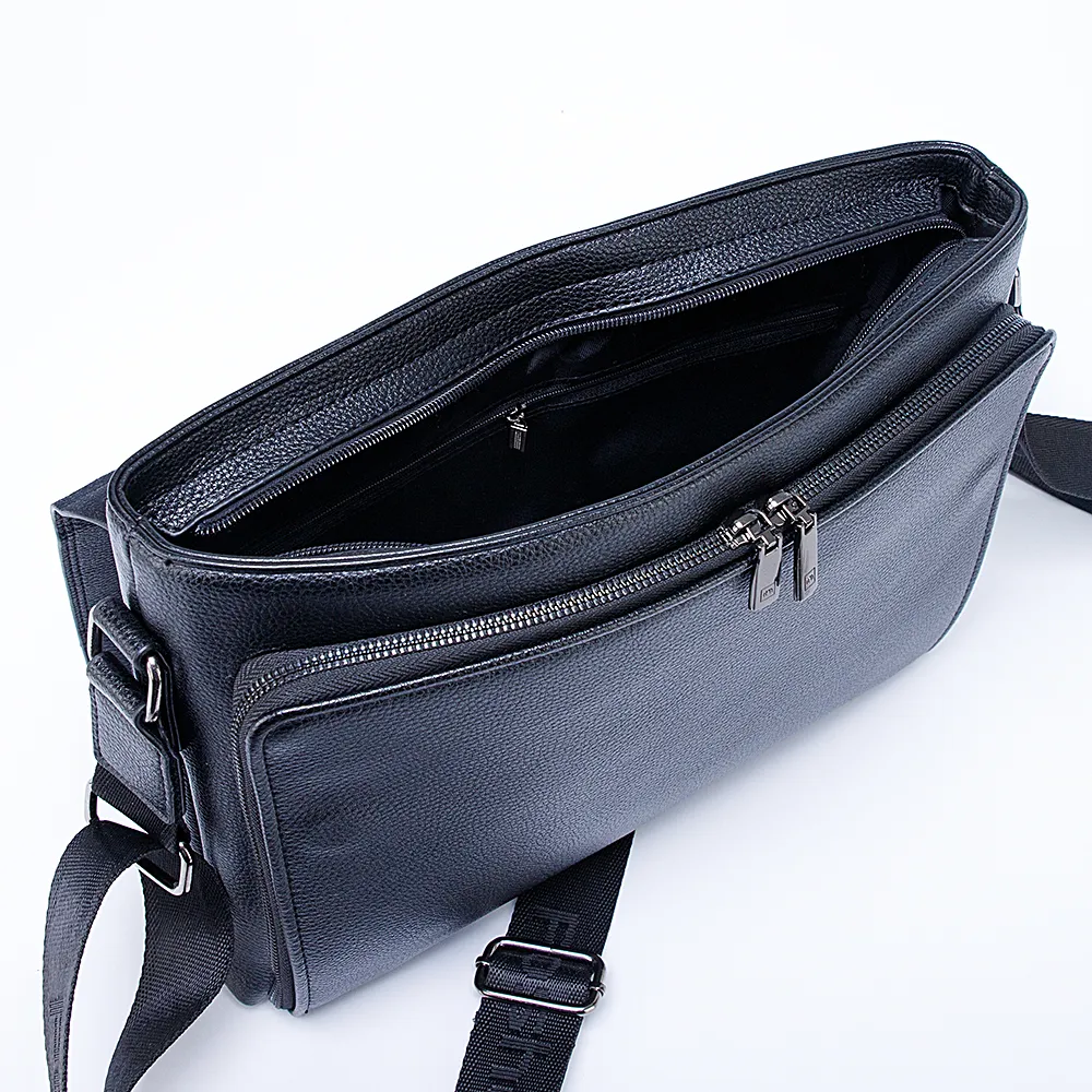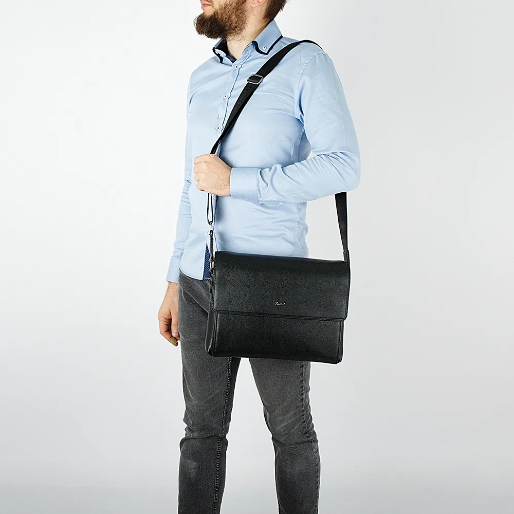 Деловая мужская сумка-портфель от бренда Poshete выполнена в чёрном цвете из мягкой искусственной кожи. Модель с лёгкостью вмещает в себя документы. Сумка закрывается на клапан с двумя скрытыми магнитами, под ним накладной карман-папка на молнии, которая расстёгивается по трём сторонам и имеет два кармашка для карточек и основное отделение на молнии, внутри которого три дополнительных кармашка. Снаружи карман на молнии, плечевой ремень текстильный, несъёмный, регулируемый.