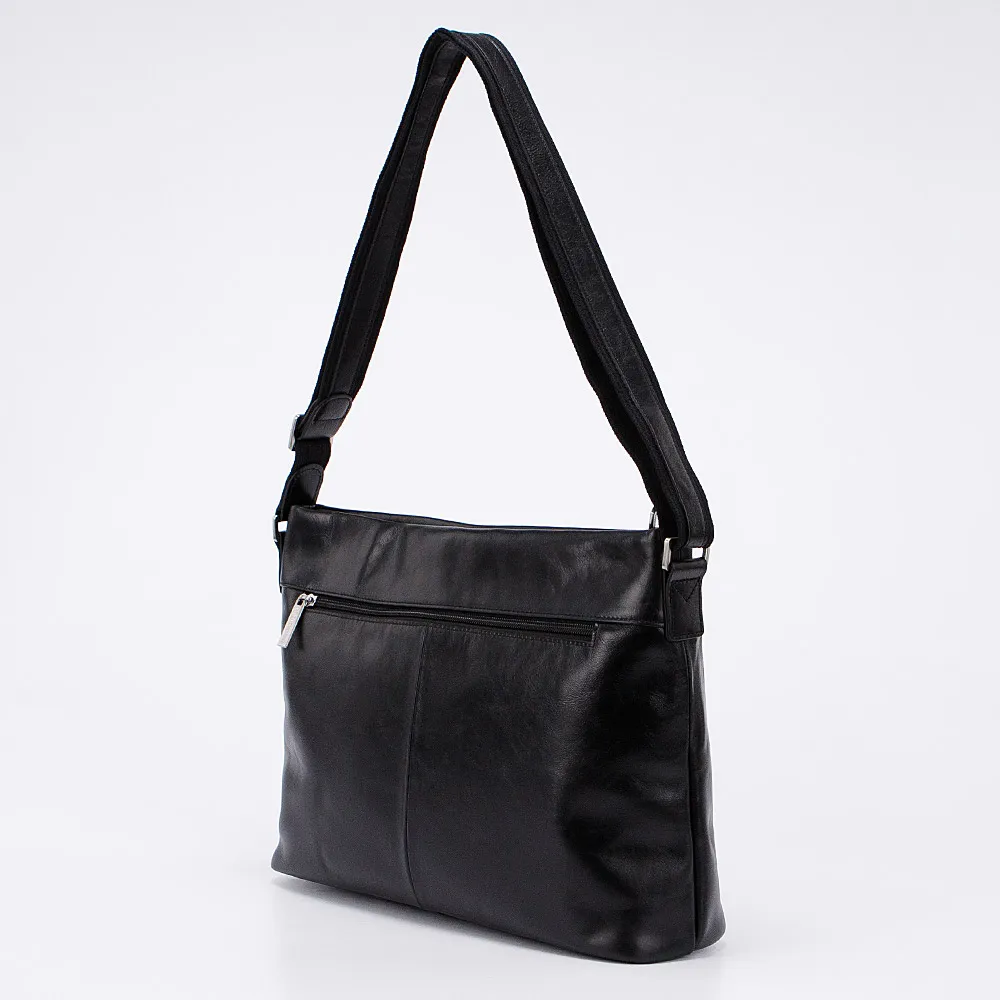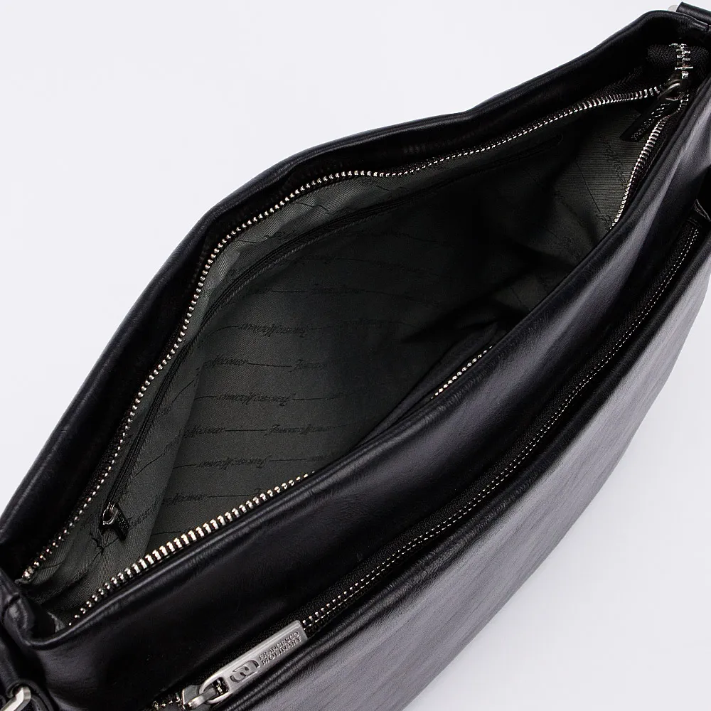 Сумка-планшет от торговой марки Francesco Molinary из натуральной кожи черного цвета. Модель с несъемным регулируемым плечевым ремнем. Отделение на молнии. Внутри: фирменная подкладка, карман на молнии, два накладных кармана. На лицевой и задней сторонах – карман на молнии.