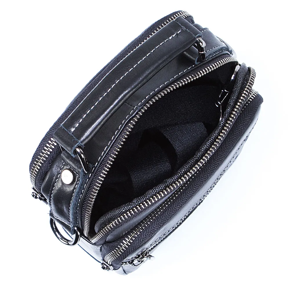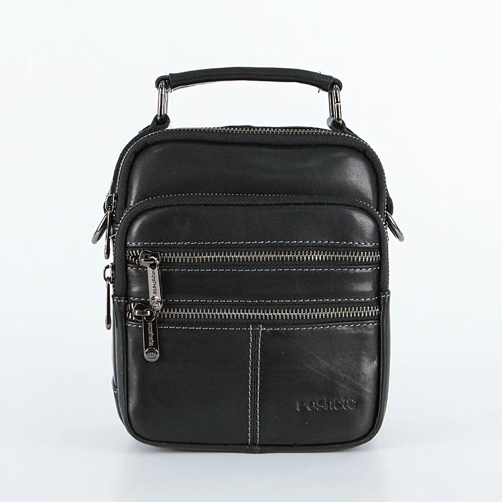 Сумка от торговой марки Poshete из натуральной кожи черного цвета с контрастной отстрочкой. Модель вертикальной ориентации с одной ручкой и съемным регулируемым плечевым ремнем, выполненным из текстильного материала. Два отделения на молнии, с текстильной подкладкой. В заднем отделении – карман на молнии. На лицевой стороне – три кармана на молнии. На задней стороне – карман на молнии.