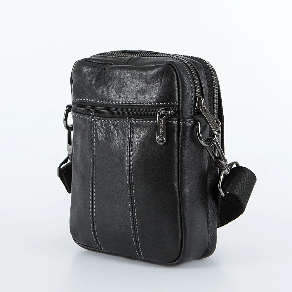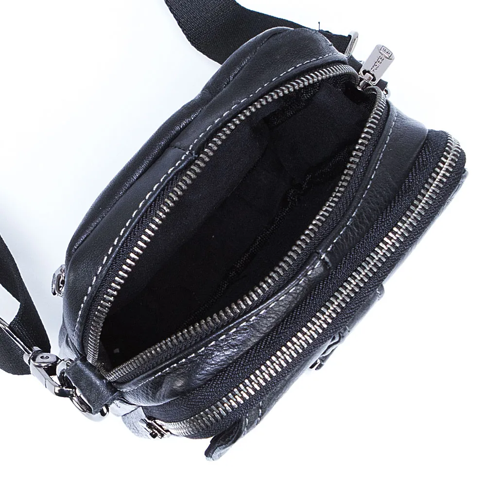 Сумка от торговой марки Poshete из натуральной кожи черного цвета с контрастной отстрочкой. Модель вертикальной ориентации со съемным регулируемым плечевым ремнем, выполненным из текстильного материала. Два отделения на молнии, с текстильной подкладкой. В заднем отделении – карман на молнии. На лицевой стороне – накладной карман с клапаном на магнитной кнопке. На задней стороне – карман на молнии.