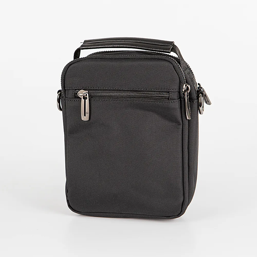 Сумка от торговой марки Valigetti из прочного текстильного материала и искусственной кожи черного цвета. Компактная модель с одной ручкой и съемным регулируемым плечевым ремнем. Два отделения на молнии, с текстильной подкладкой. В заднем отделении – накладной карман. На лицевой и задней сторонах – карман на молнии.