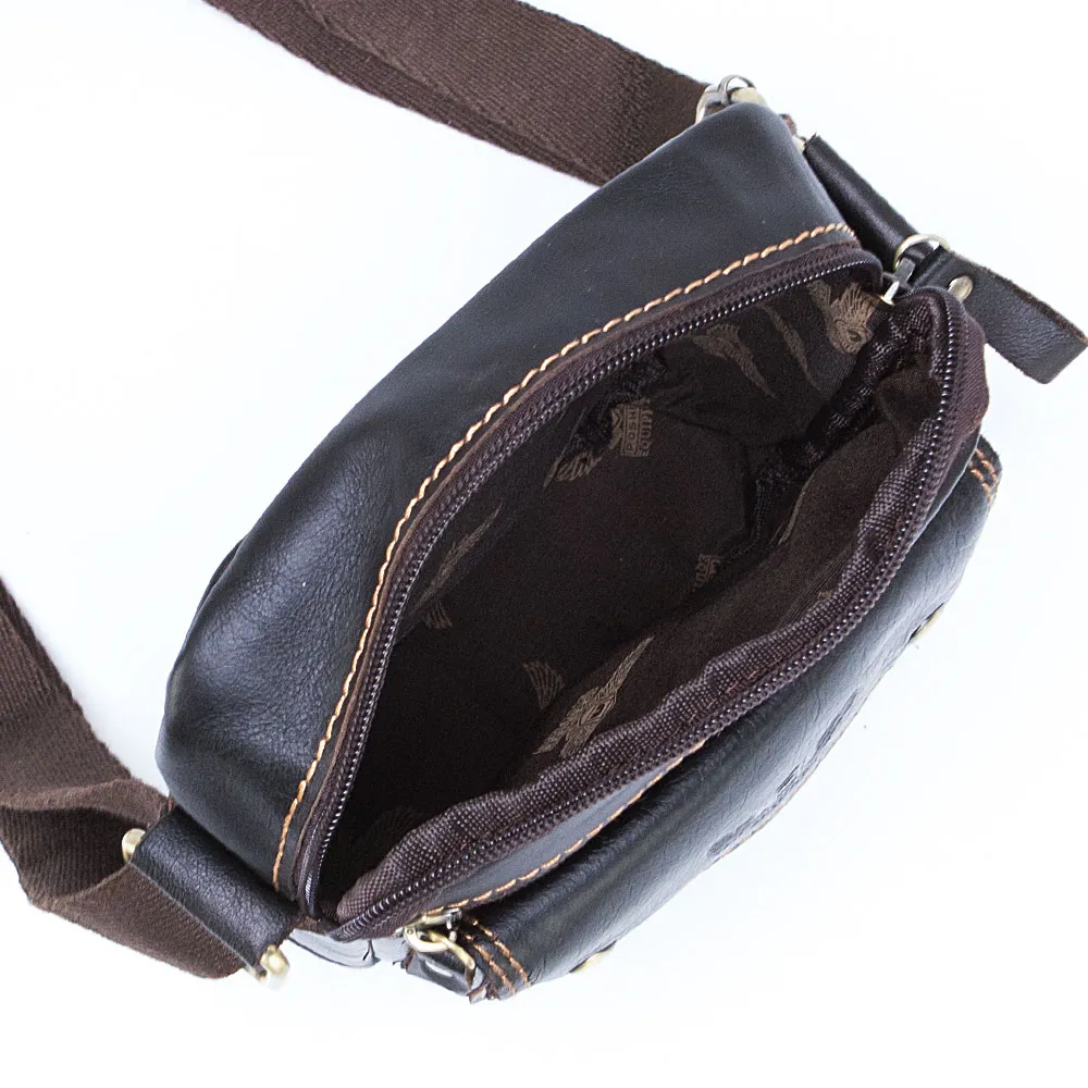 Сумка от торговой марки Poshete выполнена из натуральной кожи коричневого цвета с контрастной отстрочкой. Модель вертикальной ориентации с несъемным плотным регулируемым плечевым ремнем. Отделение на молнии. Внутри: текстильная подкладка, карман на молнии. На лицевой стороне – накладной карман с клапаном и карман на молнии.