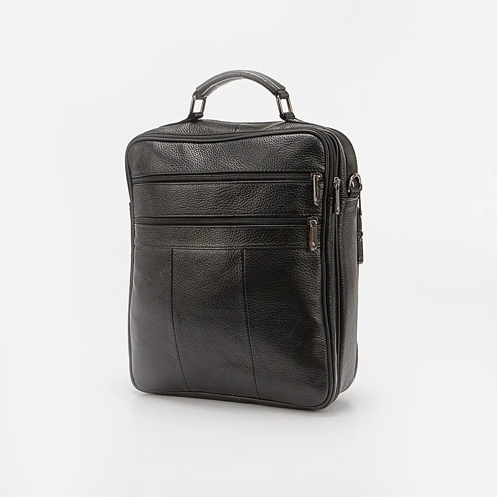 Сумка от торговой марки Poshete из натуральной кожи черного цвета. Модель вертикальной ориентации с одной ручкой и съемным регулируемым плечевым ремнем, выполненным из текстильного материала. Два отделения на молнии, с текстильной подкладкой. В заднем отделении – карман на молнии. На лицевой стороне – три кармана на молнии, на задней стороне – два кармана на молнии.