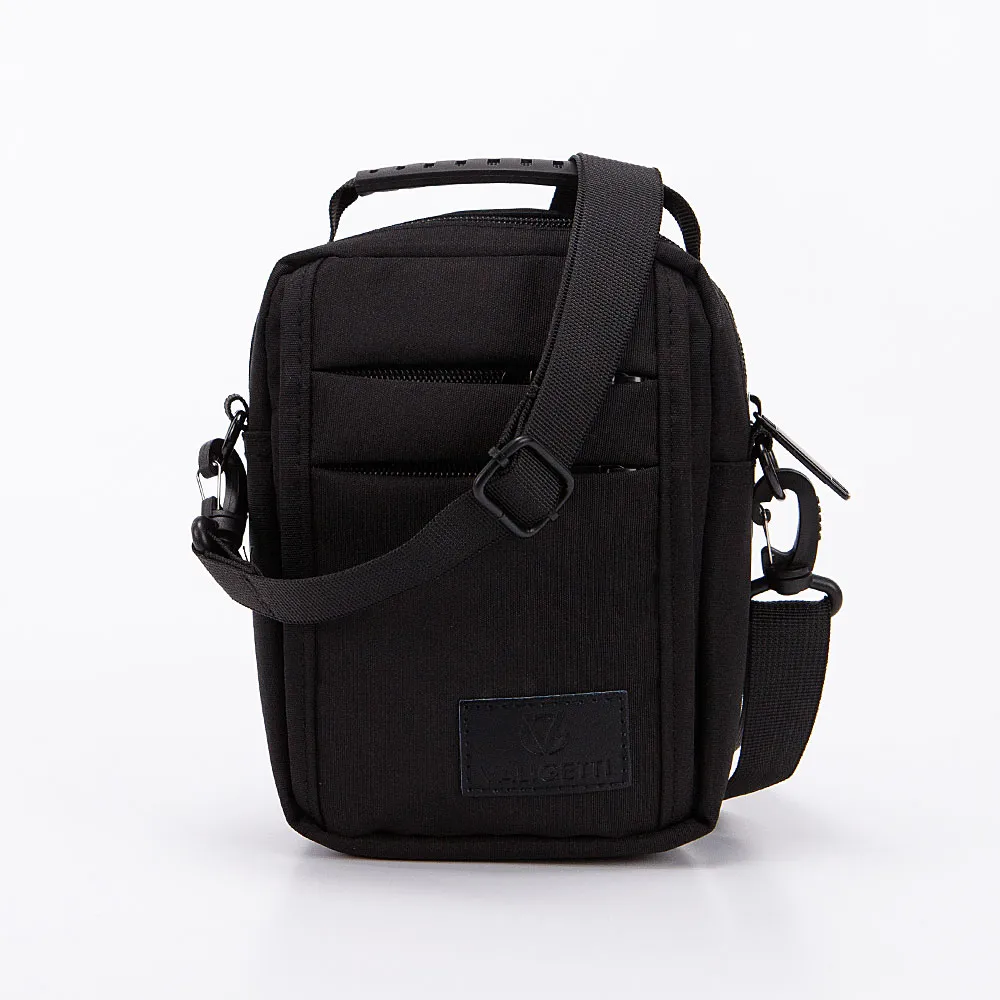 Сумка от торговой марки Valigetti из текстильного материала черного цвета. Модель с одной ручкой с прорезиненной накладкой, съемным регулируемым плечевым ремнем. Два отделения на молнии, с текстильной подкладкой. В одном из отделений – карман на молнии. На лицевой стороне – два кармана на молнии. Сзади имеется шлевка для крепления и ношения на ремне.