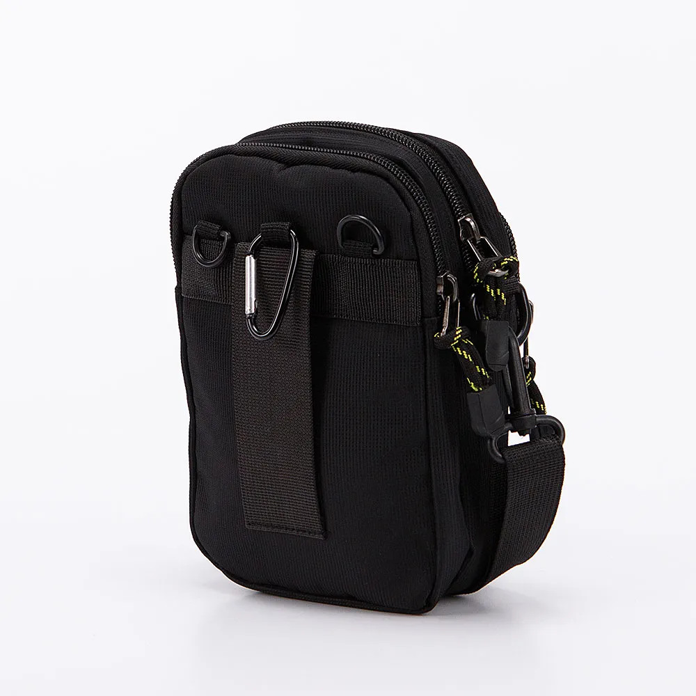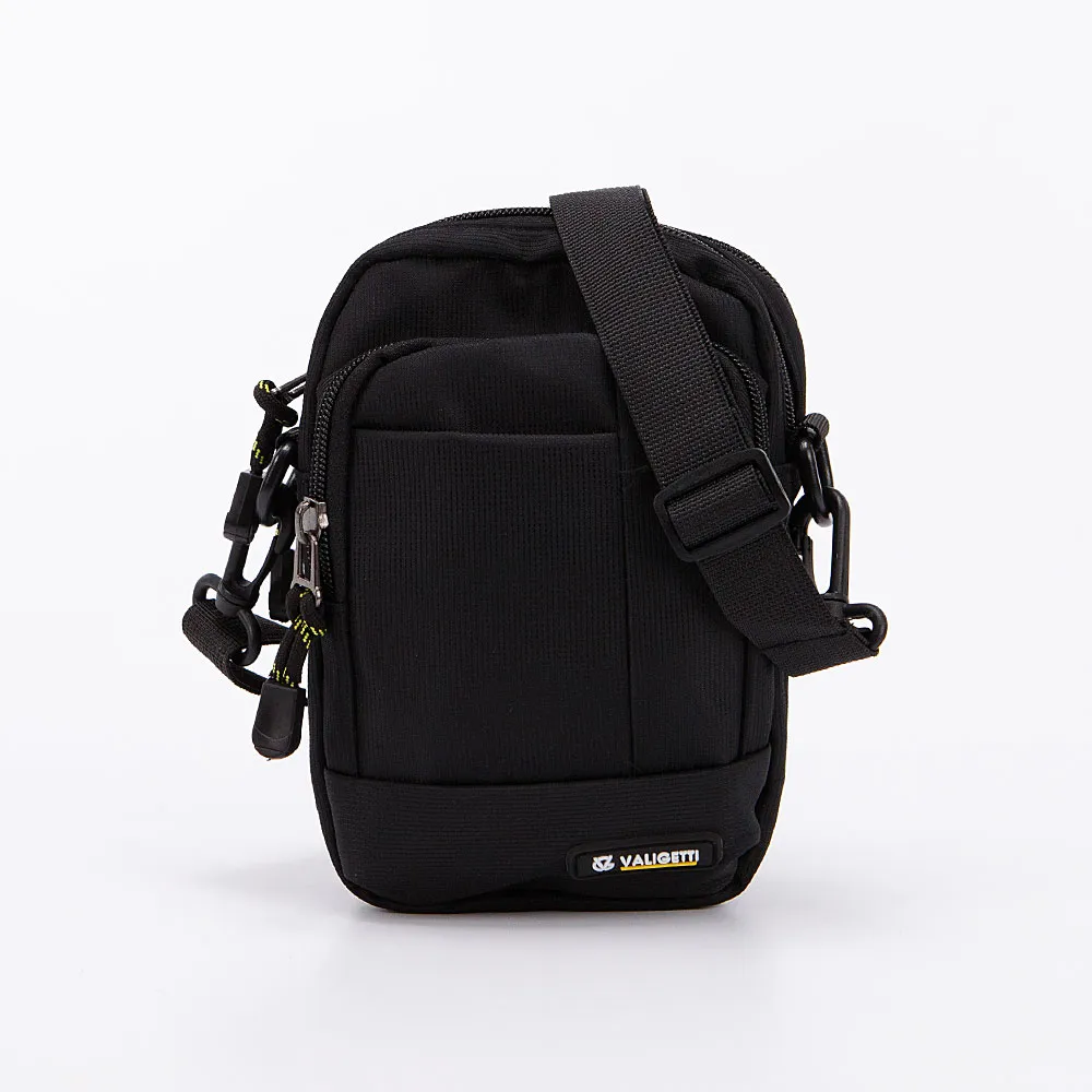 Сумка-планшет от торговой марки Valigetti из текстильного материала черного цвета. Модель со съемным регулируемым плечевым ремнем, который можно крепить как сбоку, так и сзади. Два отделения на молнии, с текстильной подкладкой. В одном из отделений – накладной карман. На лицевой стороне – два кармана на молнии. Сзади имеется шлевка для крепления и ношения на ремне и карабин для крепления.