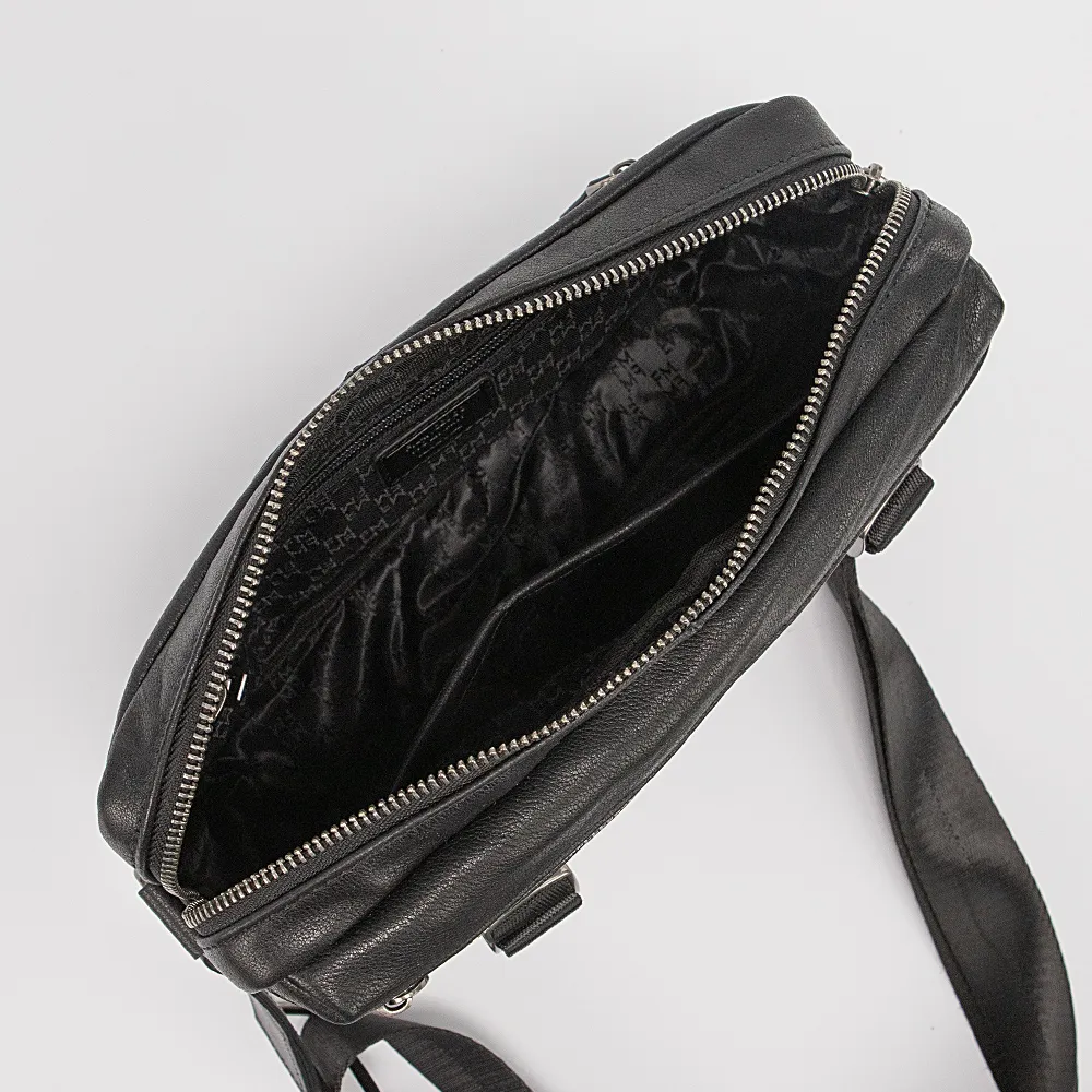 Сумка-планшет от торговой марки Francesco Molinary из качественной натуральной кожи черного цвета. Модель с несъемным регулируемым плечевым ремнем, выполненным из текстильного материала. Отделение на молнии. Внутри: фирменная подкладка, карман на молнии, накладной карман. На лицевой стороне – декоративные ремешки с пряжкой, карман на молнии. На задней стороне – карман на молнии.