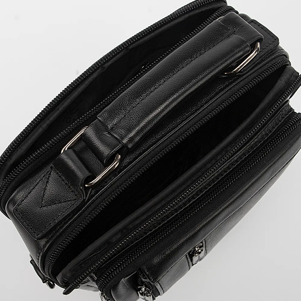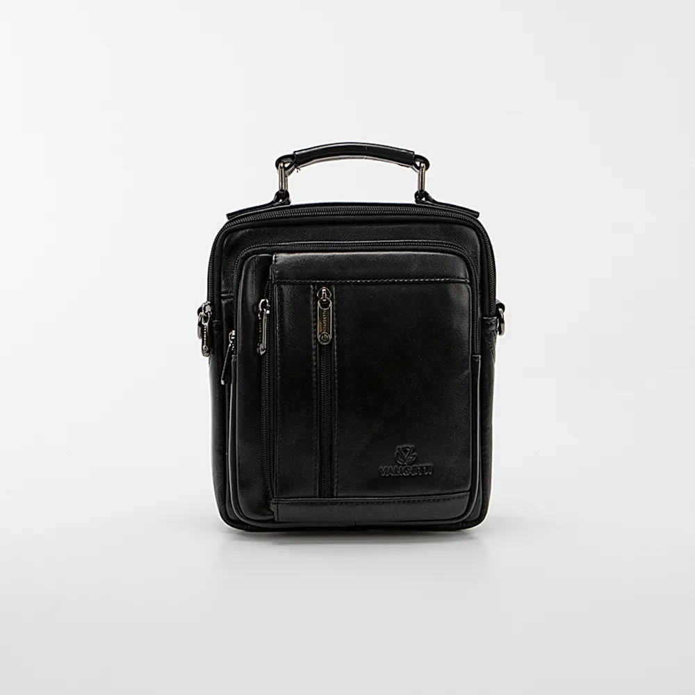 Сумка от торговой марки Valigetti из натуральной кожи черного цвета. Модель с одной ручкой и съемным регулируемым плечевым ремнем, выполненным из текстильного материала. Два отделения на молнии, с фирменной подкладкой. В заднем отделении – карман на молнии. На лицевой стороне – три кармана на молнии. На задней стороне – карман на молнии.