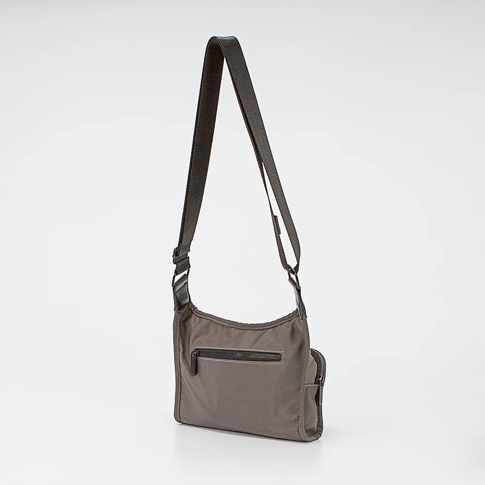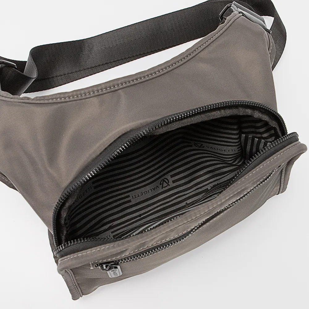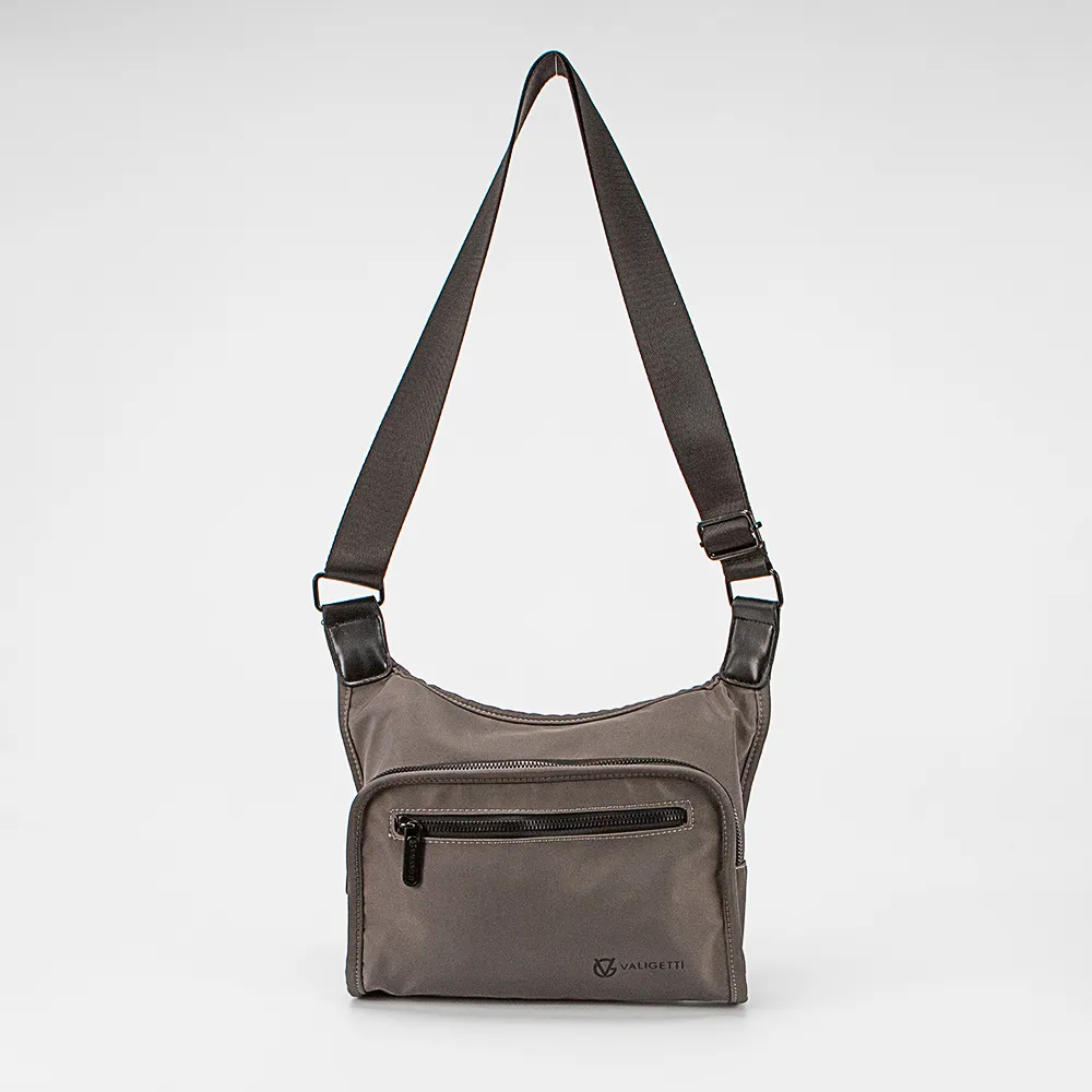 Cумка-планшет от торговой марки Valigetti из прочного практичного текстильного материала серого цвета. Модель с несъемным регулируемым плечевым ремнем. Отделение на молнии. Внутри: текстильная подкладка, карман на молнии, кожаный накладной карман для карт. На лицевой и задней сторонах – карман на молнии.