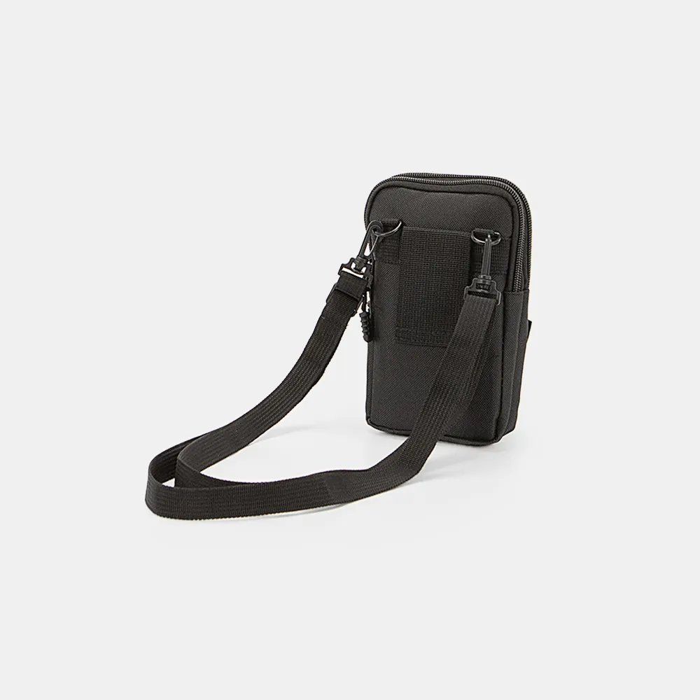 Сумка от торговой марки Ecotope из практичного текстильного материала черного цвета. Модель со съемным регулируемым плечевым ремнем. Два отделения на молнии, с текстильной подкладкой. На лицевой стороне – накладной карман с клапаном на застежке фастекс; внутри: кармашек для карты. На задней стороне – лямка для ношения на ремне.
