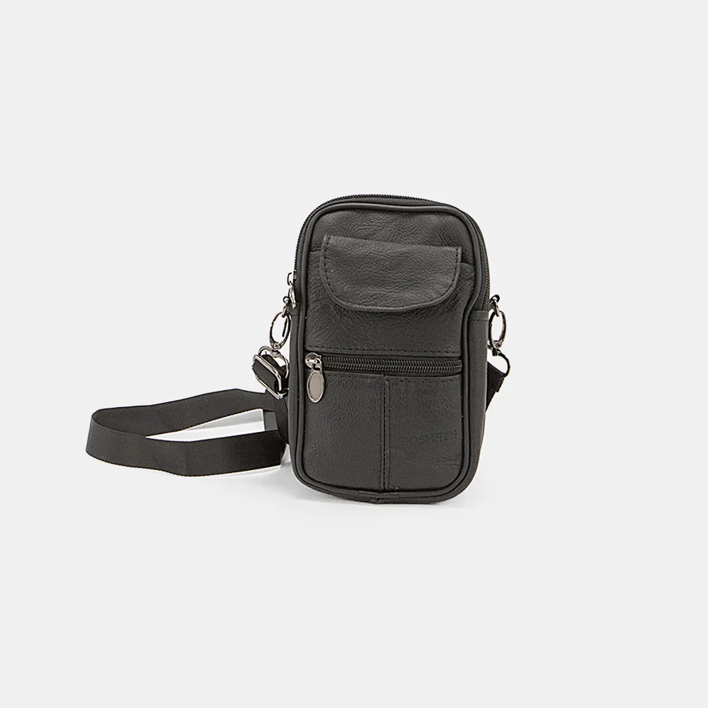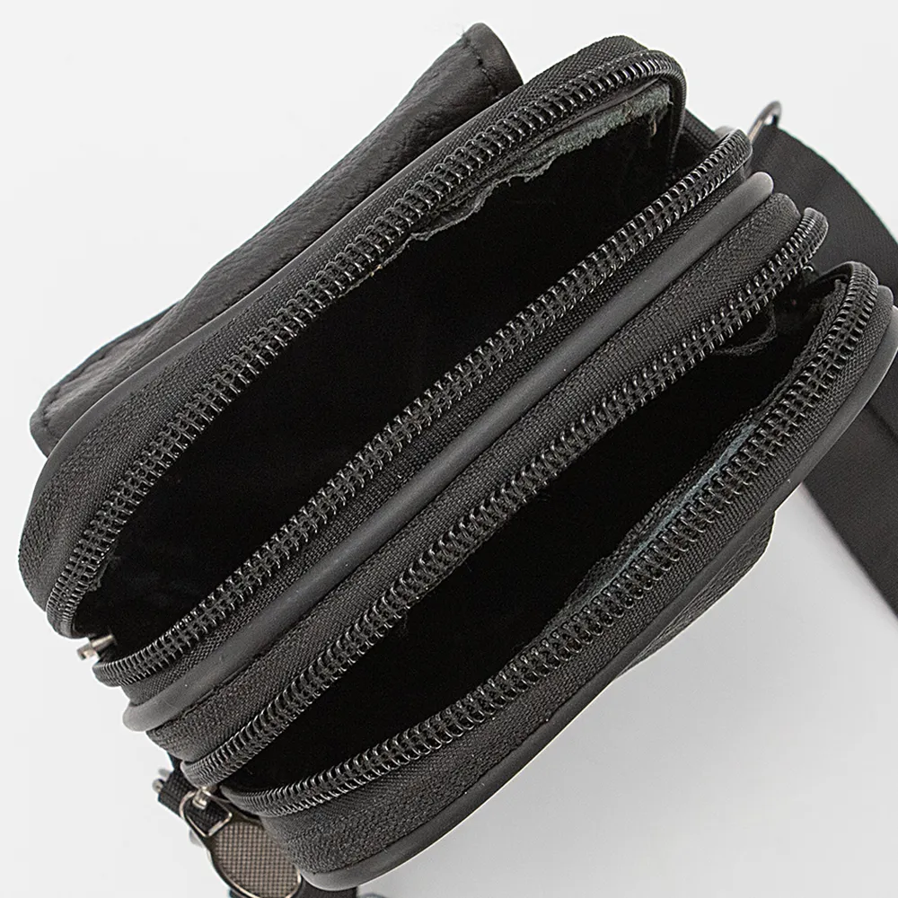 Сумка от торговой марки Poshete из натуральной кожи черного цвета. Модель со съемным регулируемым плечевым ремнем. Два отделения на молнии, с текстильной подкладкой. На лицевой стороне – накладной карман с клапаном и карман на молнии. На задней стороне – лямка для ношения на ремне.