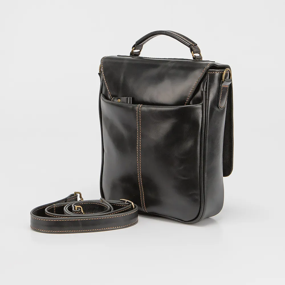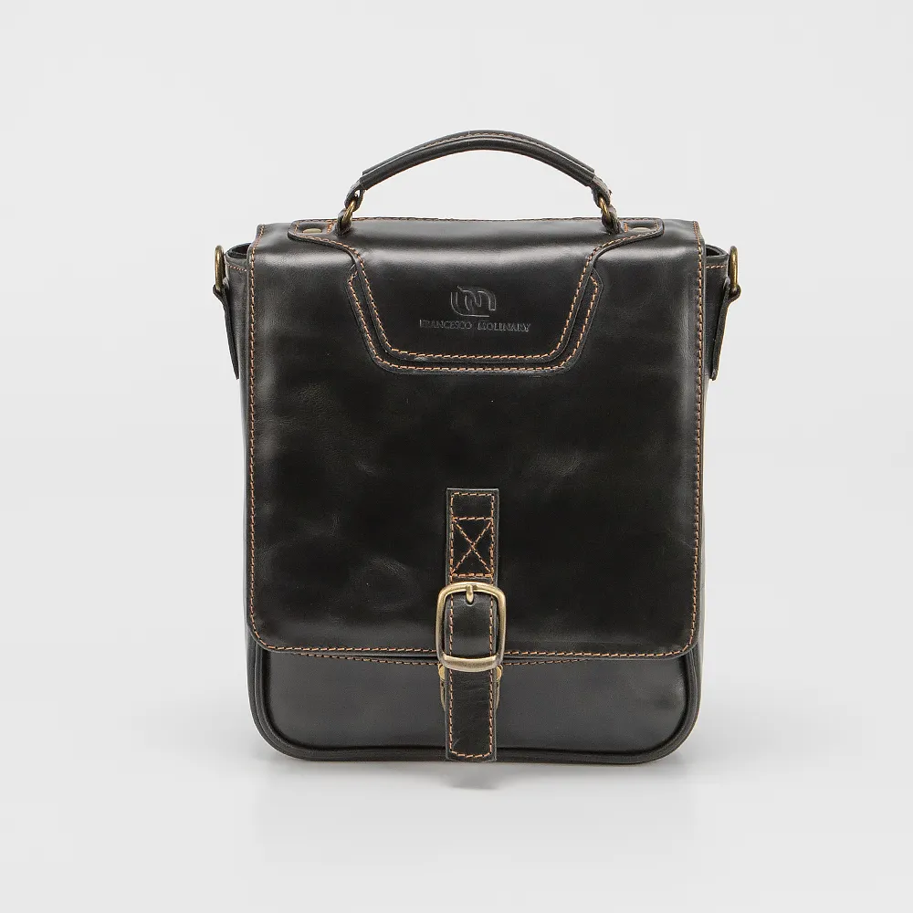 Сумка от торговой марки Francesco Molinary изготовлена из натуральной гладкой кожи черного цвета. Модель с ручкой и съемным регулируемым плечевым ремнем. Отделение закрывается клапаном на цупферном замке. Внутри: фирменная подкладка, карман на молнии, образующий накладной карман. На задней стороне - карман на молнии.