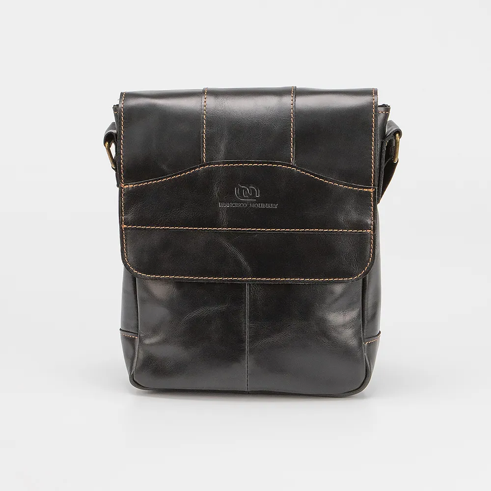 Сумка от торговой марки Francesco Molinary изготовлена из натуральной кожи черного цвета. Компактная модель с несъемным регулируемым плечевым ремнем из текстильного материала. Клапан закрывает отделение на молнии. Внутри: фирменная подкладка, карман на молнии, накладной карман. На задней стороне - карман на молнии.