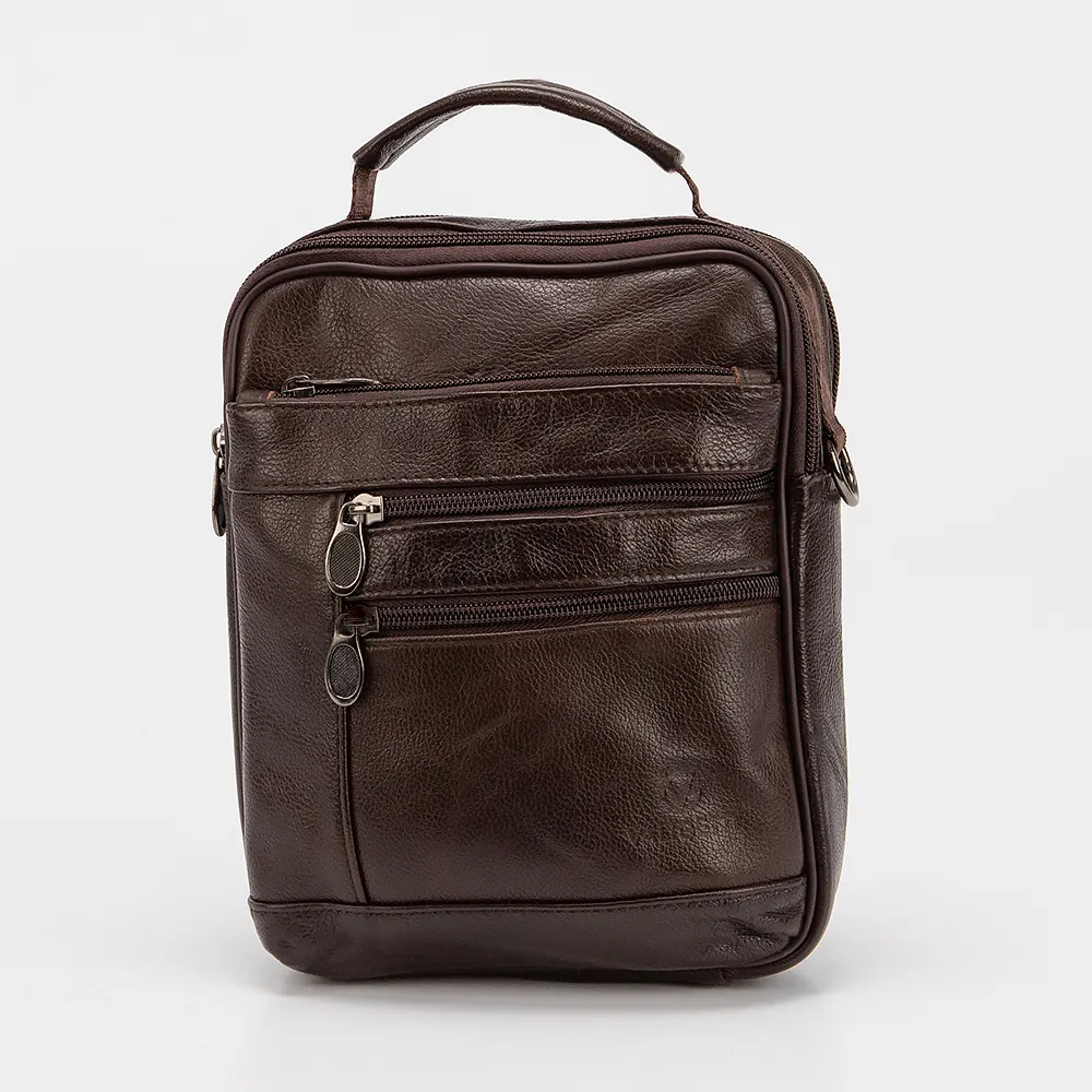 Сумка от торговой марки Valigetti выполнена из натуральной кожи коричневого цвета. Модель с ручкой для переноски и длинным регулируемым плечевым ремнем. Два отделения на молнии. С лицевой стороны - три кармана на молнии. С задней стороны - карман на молнии.