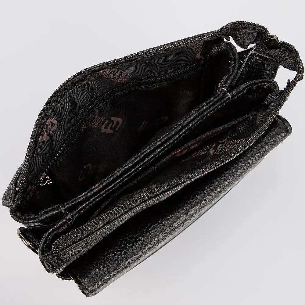 Сумка-планшет от торговой марки Francesco Molinary выполнена из натуральной зернистой кожи черного цвета. Модель с длинным регулируемым плечевым ремнем из текстильного материала. Отделение на молнии. Внутри: два отсека, фирменная текстильная подкладка, карман на молнии, накладной карман. На лицевой стороне - карман на молнии и накладной карман с клапаном. На задней стороне - карман на молнии.