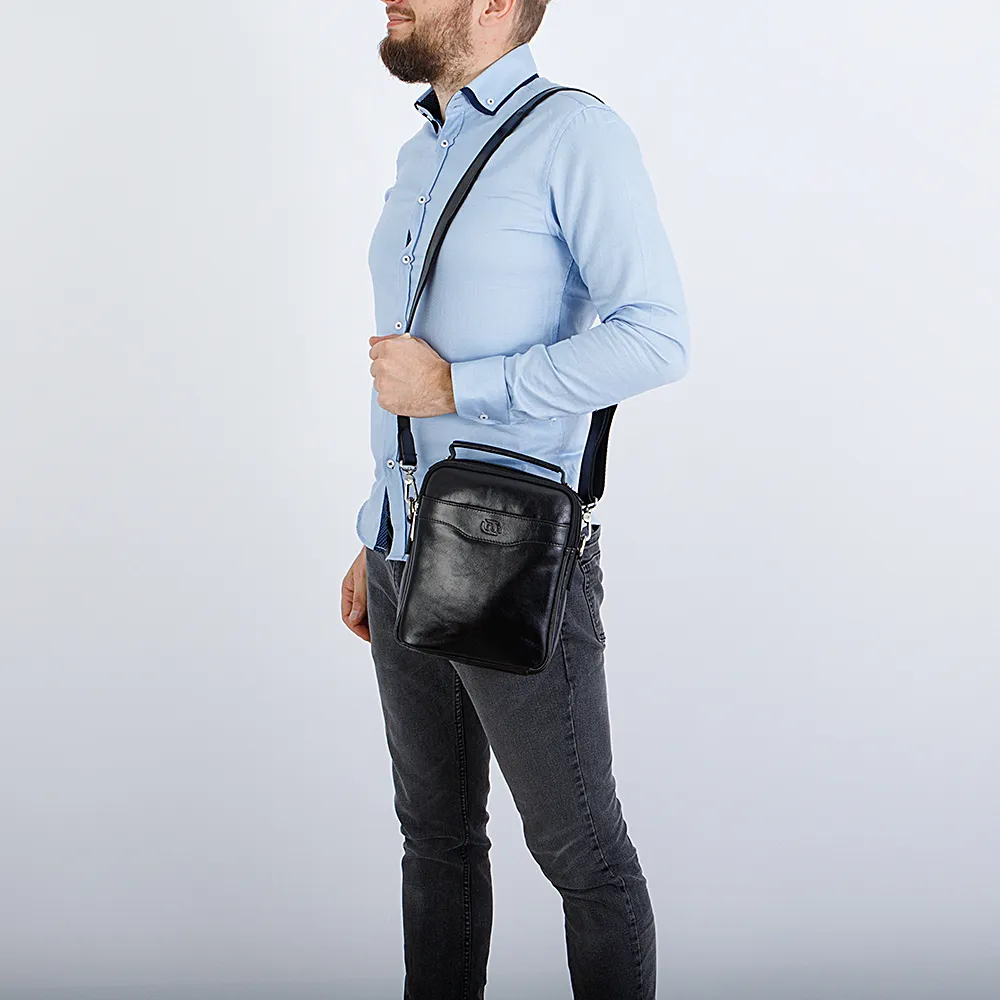 Мужская сумка Francesco Molinary из натуральной гладкой кожи. Комбинированный ремень через плечо можно отстегнуть и отрегулировать. Крепкая ручка сверху. Удобный передний потайной карман, сзади карман на молнии и два отсека, каждый со своей молнией. Металлическая фурнитура серебристого цвета. Стильная и удобная.