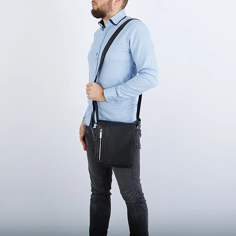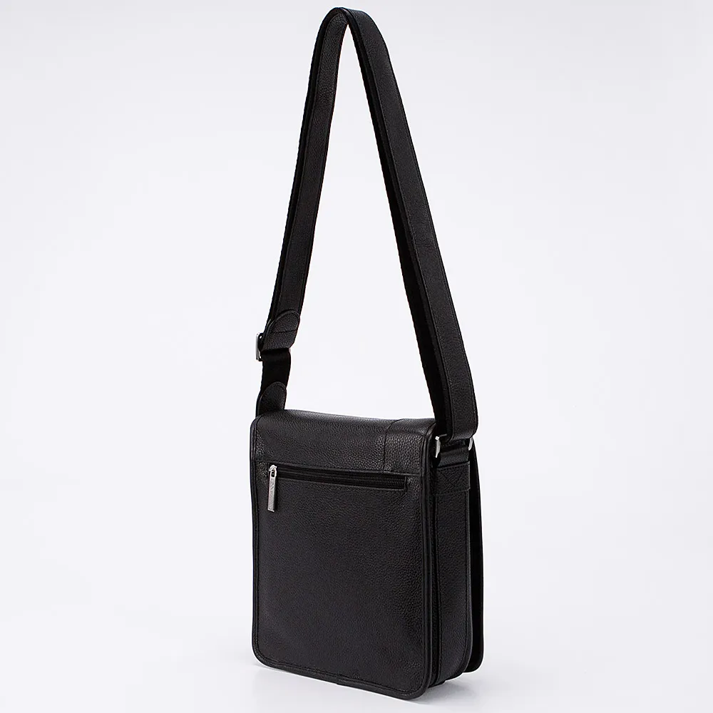Стильный мужской планшет квадратной формы на несъемном плечевом ремне, декорированном кожаными вставками. Модель выполнена из натура льной кожи черного цвета, с одним текстильным отделением под откидным клапаном на магнитной кнопке. Внутри два накладных кармана без застежки, прорези для канцелярских принадлежностей и небольшой прорезной карман на молнии. Снаружи два прорезных кармана на молнии.