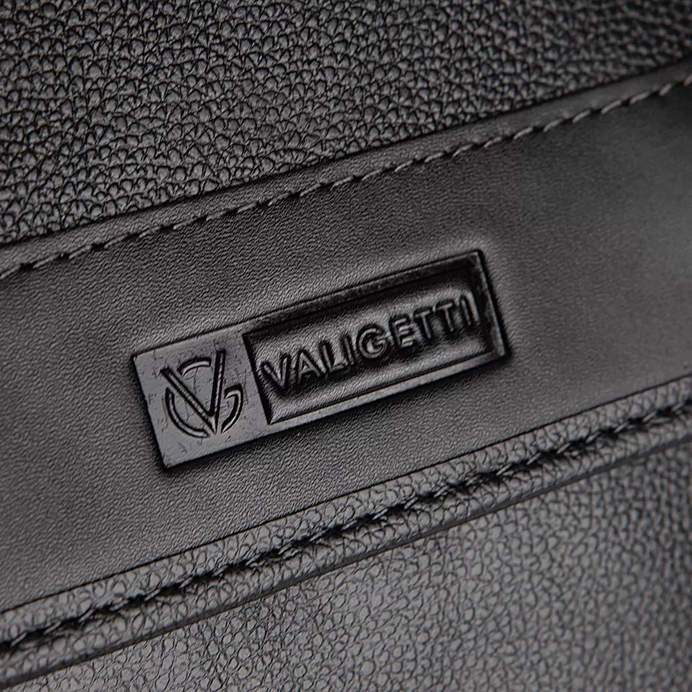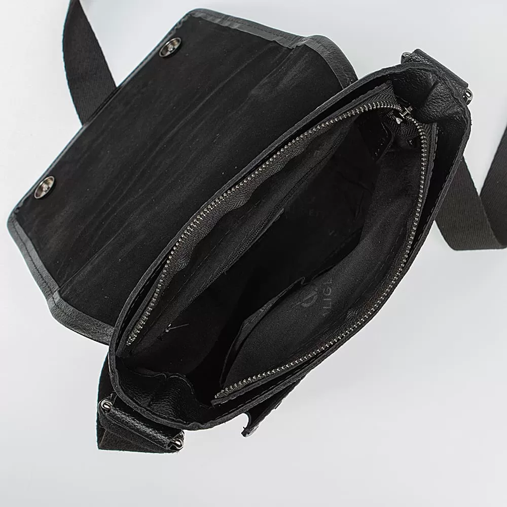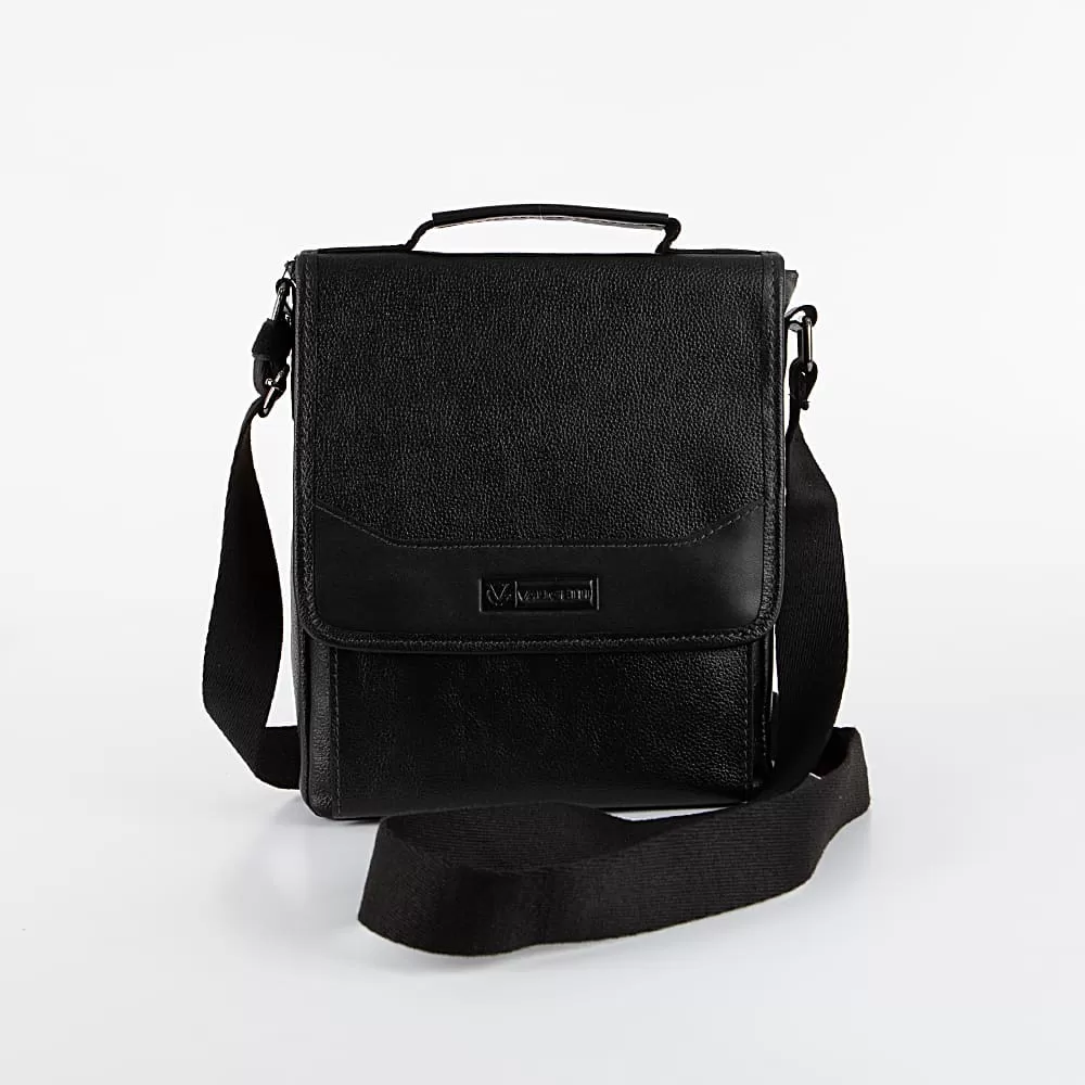 Сумка из натуральной кожи от бренда Valigetti представлена в черном цвете. Модель с одной ручкой и несъемным регулируемым плечевым ремнем, закрывается клапаном на магнитных кнопках и имеет два накладных кармана на лицевой и задней сторонах. Лицевой карман закрывается клапаном, а задний - открыт. Внутри сумки одно отделение, которое закрывается на молнию. Внутри отделения находится фирменная текстильная подкладка, один карман на молнии и два накладных кармана. Важно отметить, что данная модель не предназначена для хранения документов формата А4.
