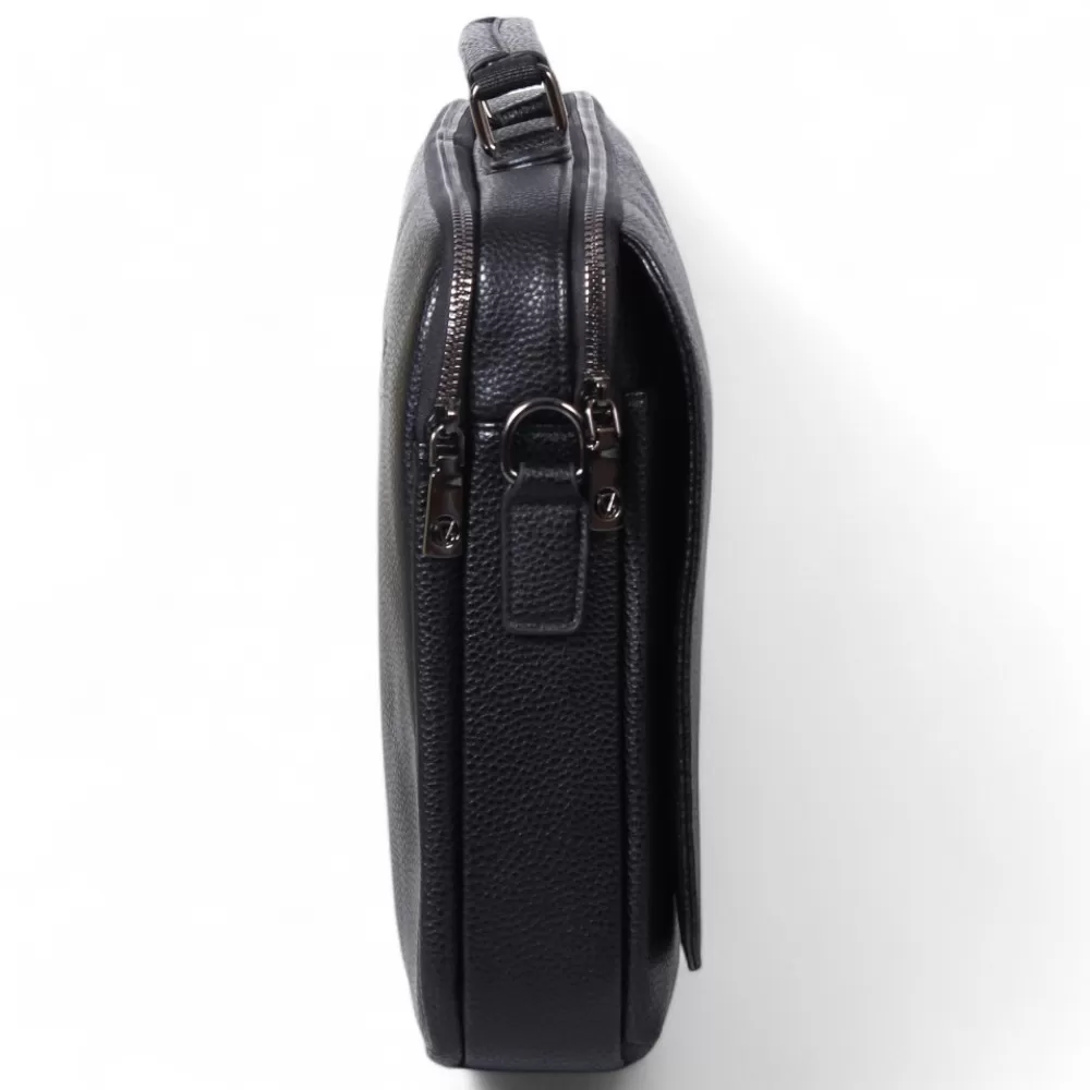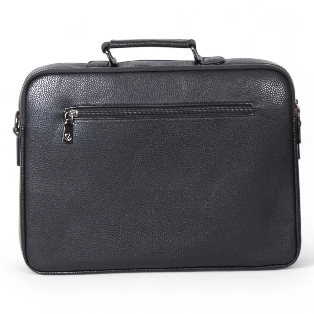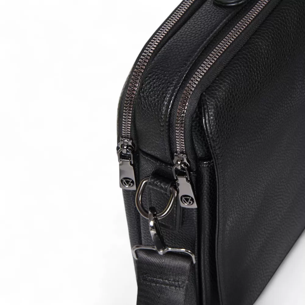 Портфель от бренда Valigetti выполнен из искусственной кожи черного цвета. Модель с ручкой и съемным плечевым ремнем, выполненным из текстильного материала. Два отделения на молнии. Внутри: текстильная подкладка, карман на молнии, накладной карман, карман с уплотненной стенкой для ноутбука. На лицевой стороне — накладной карман с клапаном. На задней стороне — карман на молнии.