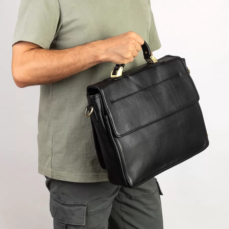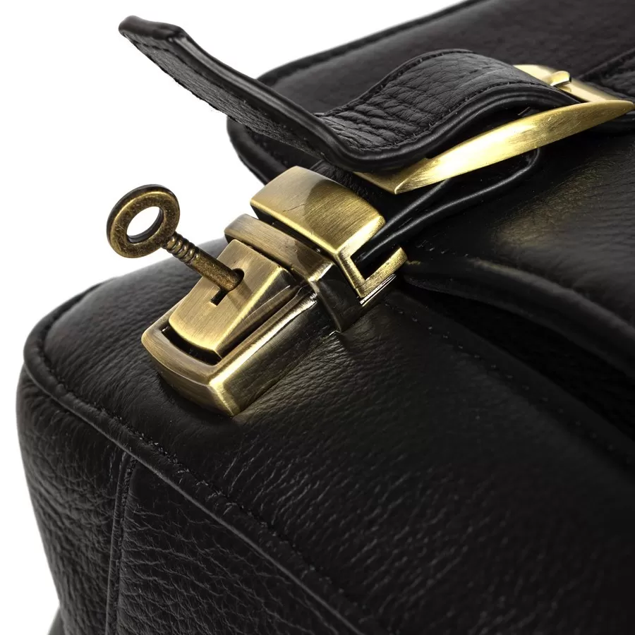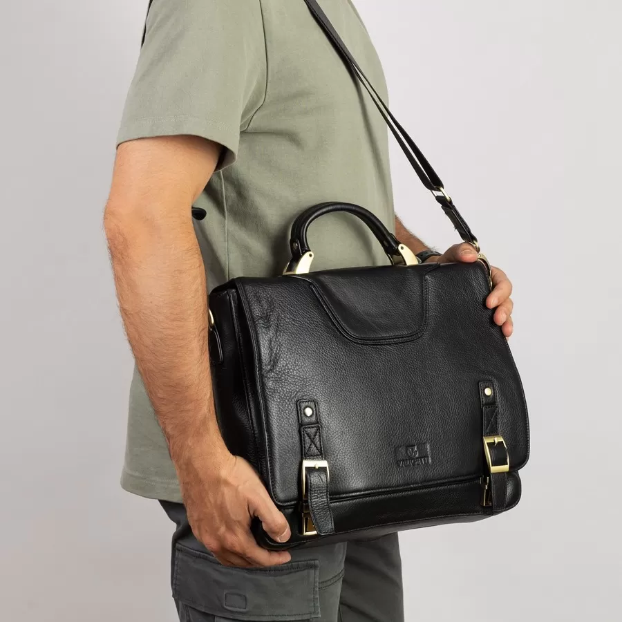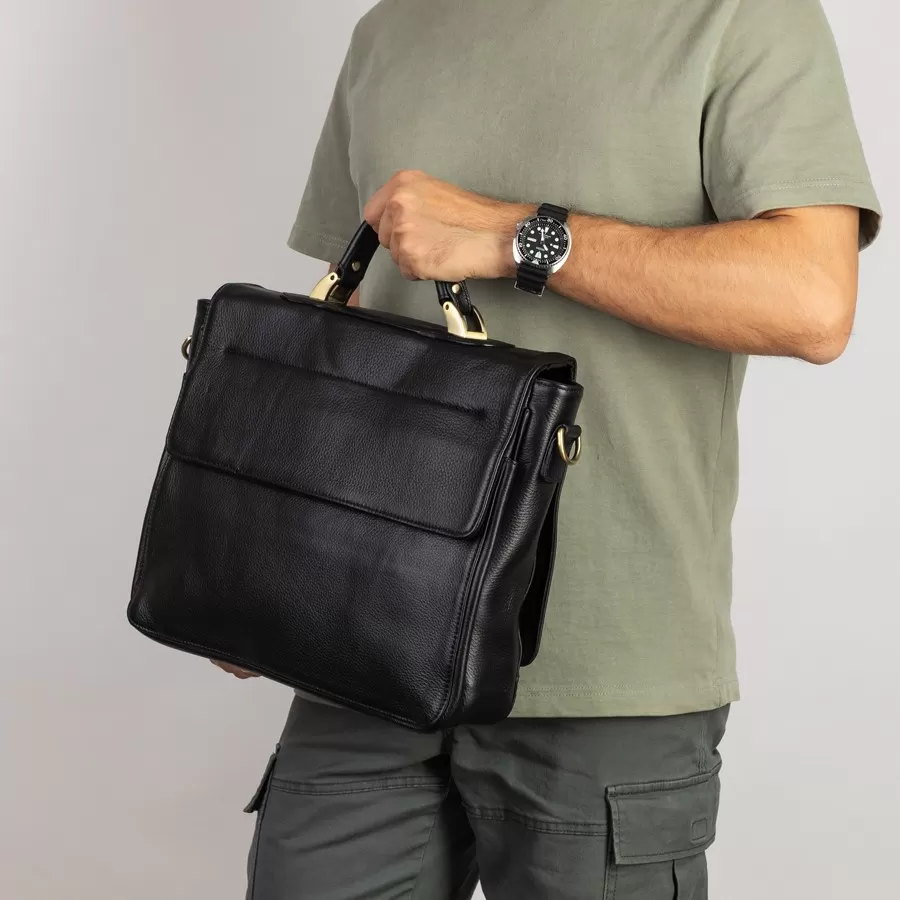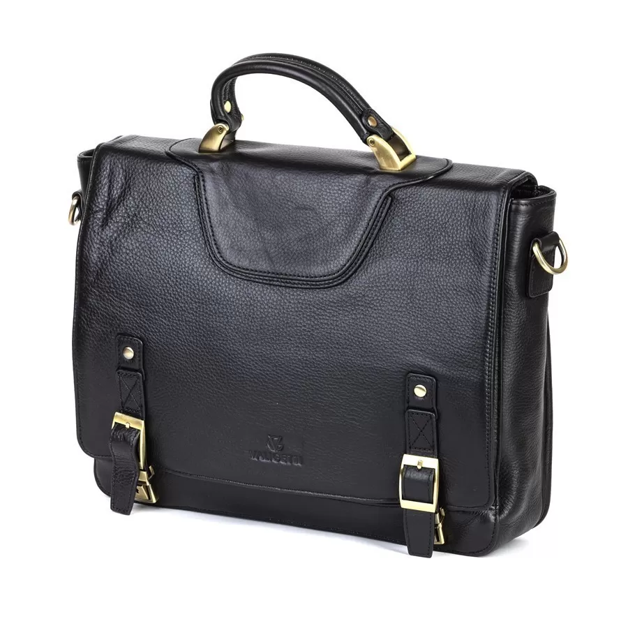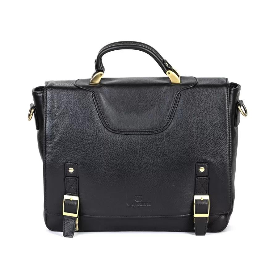 Портфель от торговой марки Valigetti из натуральной кожи черного цвета. Модель с одной ручкой, съемным регулируемым плечевым ремнем, выполненным из текстильного материала. Клапан на двух замках закрывает отделение без молнии. В отделении: фирменная подкладка, карман на молнии, мягкая перегородка-средник на молнии. На задней стороне – накладной карман на клапане.