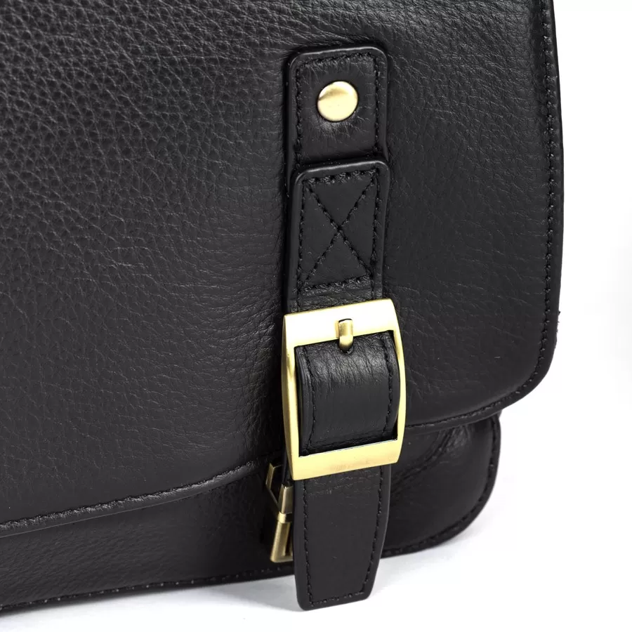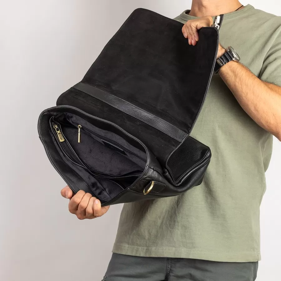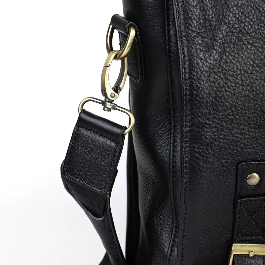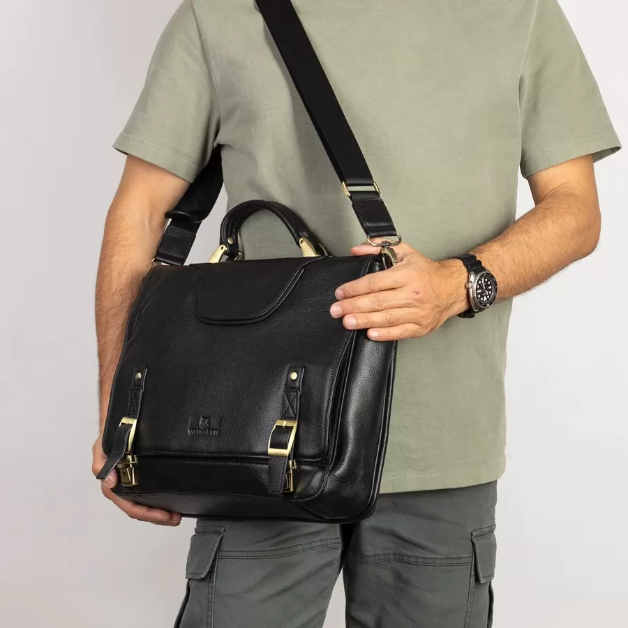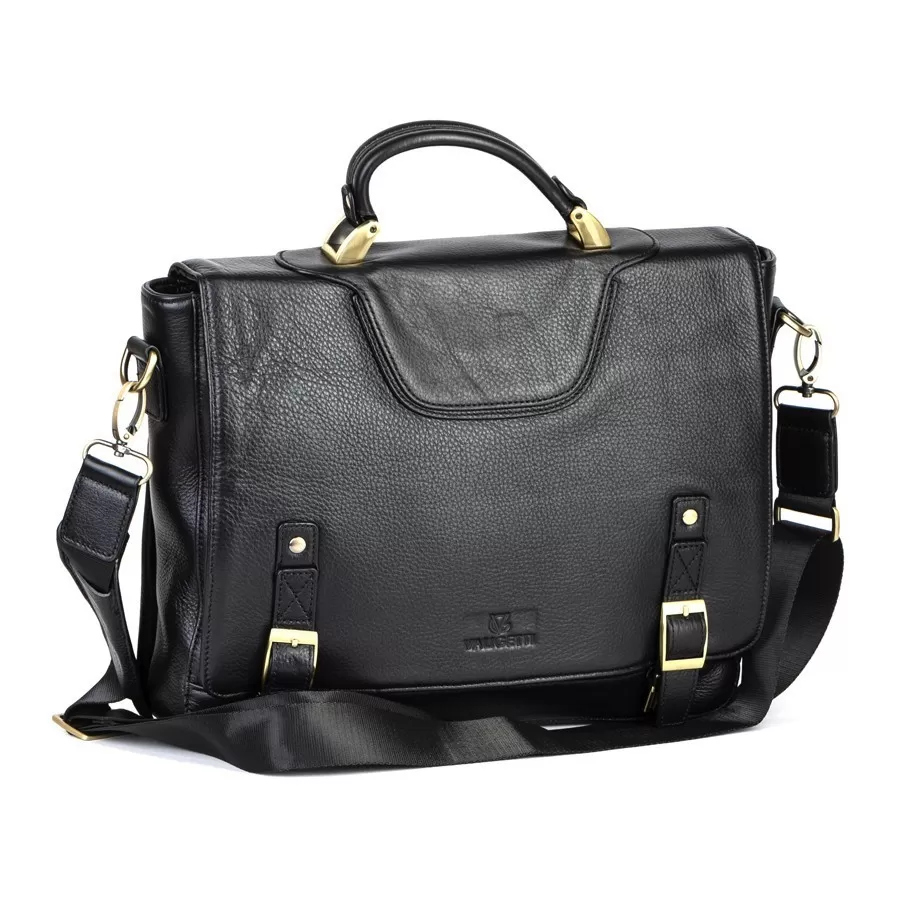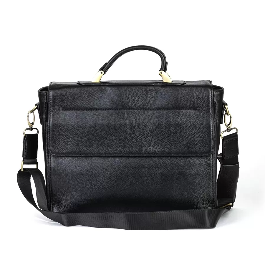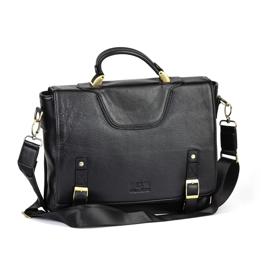 Портфель от торговой марки Valigetti из натуральной кожи черного цвета. Модель с одной ручкой, съемным регулируемым плечевым ремнем, выполненным из текстильного материала. Клапан на двух замках закрывает отделение без молнии. В отделении: фирменная подкладка, карман на молнии, мягкая перегородка-средник на молнии. На задней стороне – накладной карман на клапане.