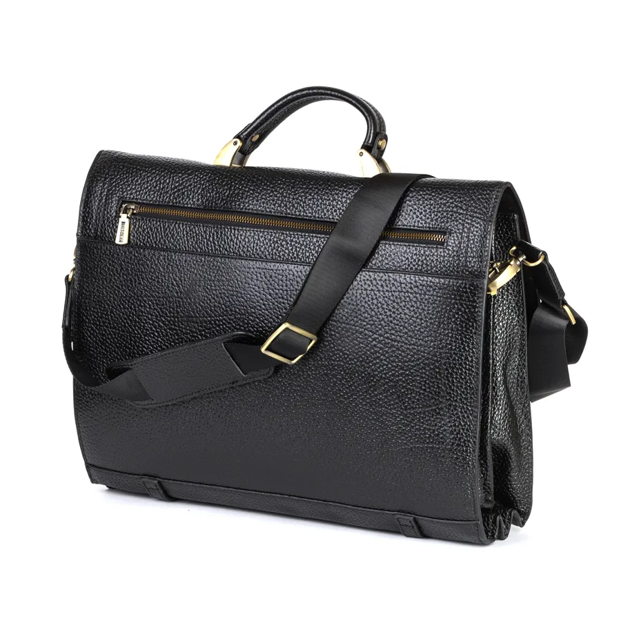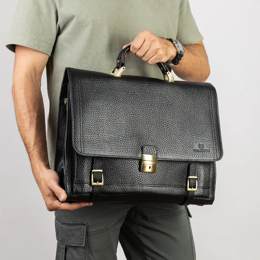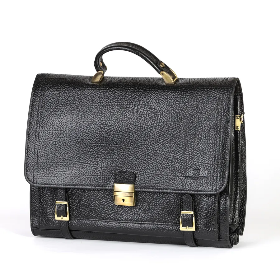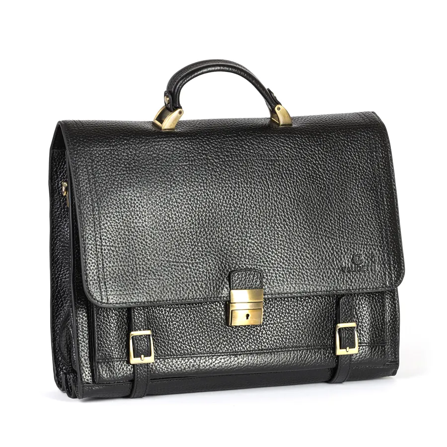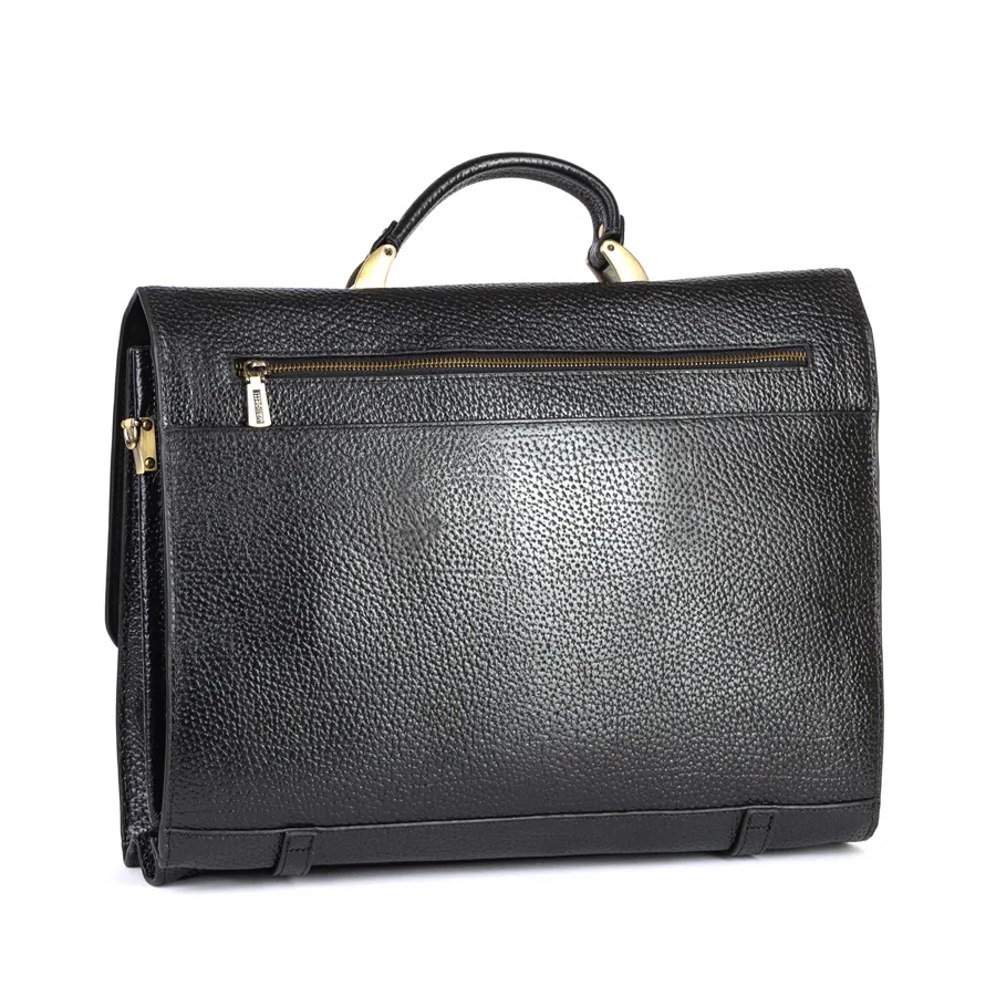 Портфель от торговой марки Valigetti из натуральной кожи черного цвета. Модель с одной ручкой, съемным регулируемым плечевым ремнем, выполненным из текстильного материала. Клапан на одном замке закрывает отделение, один вместительный накладной кармана без застежки, карман на молнии. В отделении: фирменная подкладка, карман на молнии, перегородка-средник. На задней стороне – карман на молнии.
