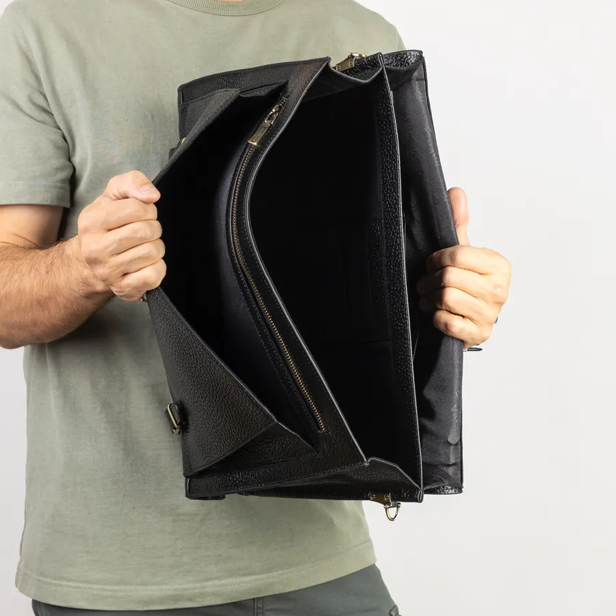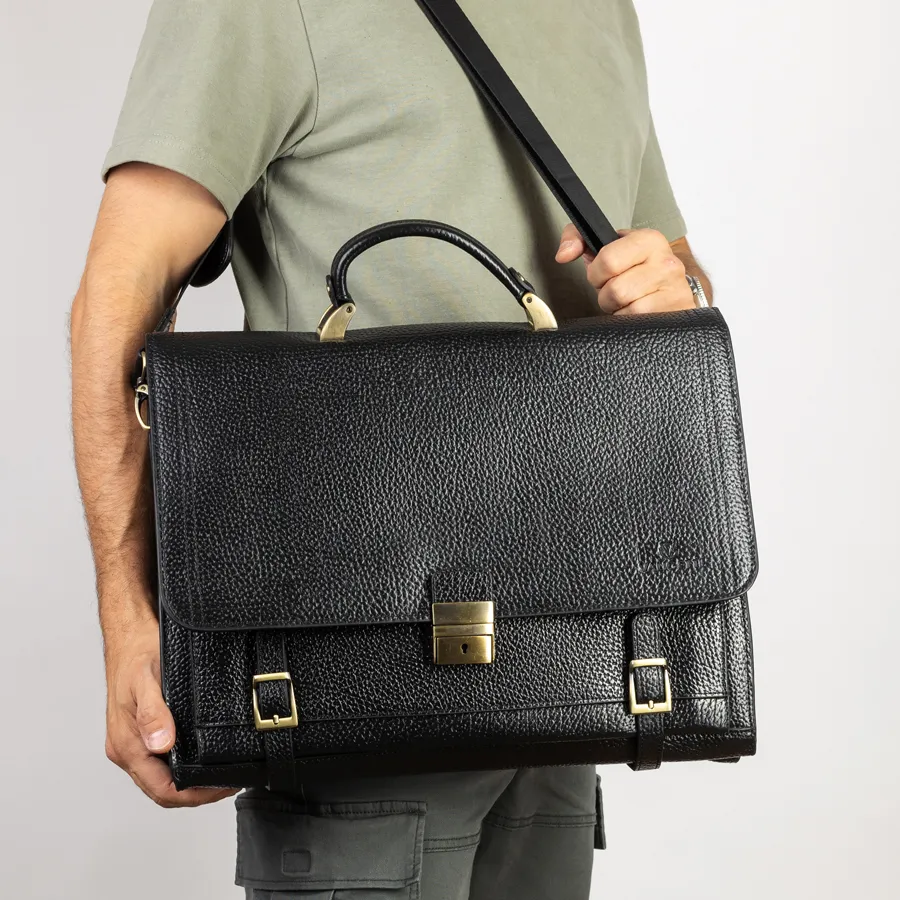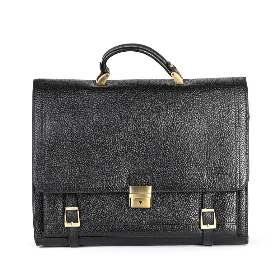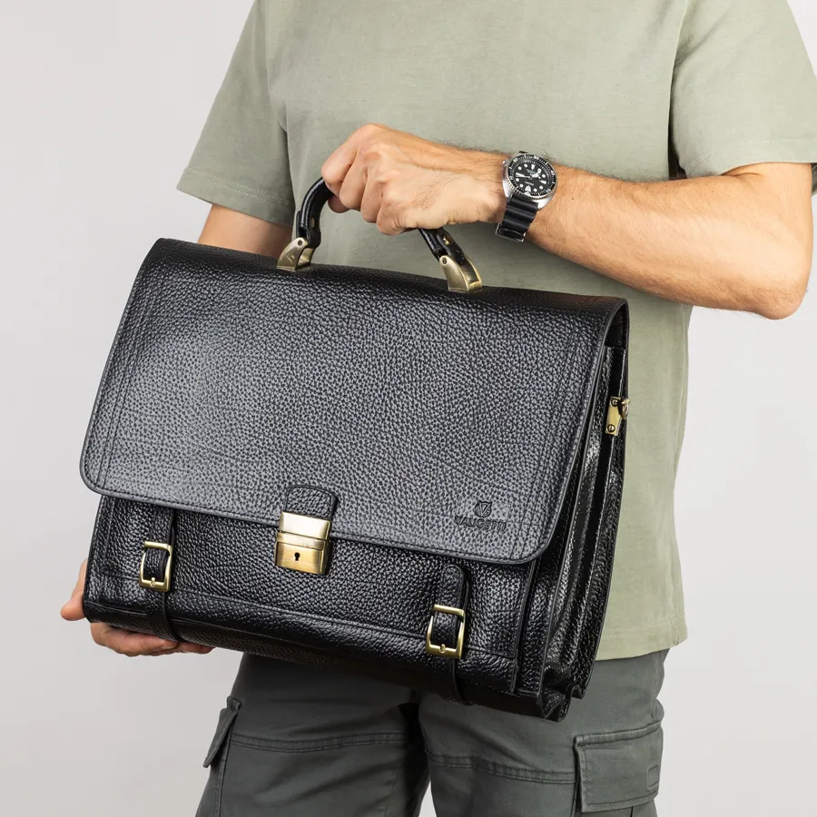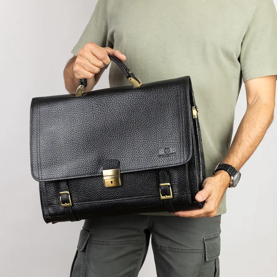 Портфель от торговой марки Valigetti из натуральной кожи черного цвета. Модель с одной ручкой, съемным регулируемым плечевым ремнем, выполненным из текстильного материала. Клапан на одном замке закрывает отделение, один вместительный накладной кармана без застежки, карман на молнии. В отделении: фирменная подкладка, карман на молнии, перегородка-средник. На задней стороне – карман на молнии.