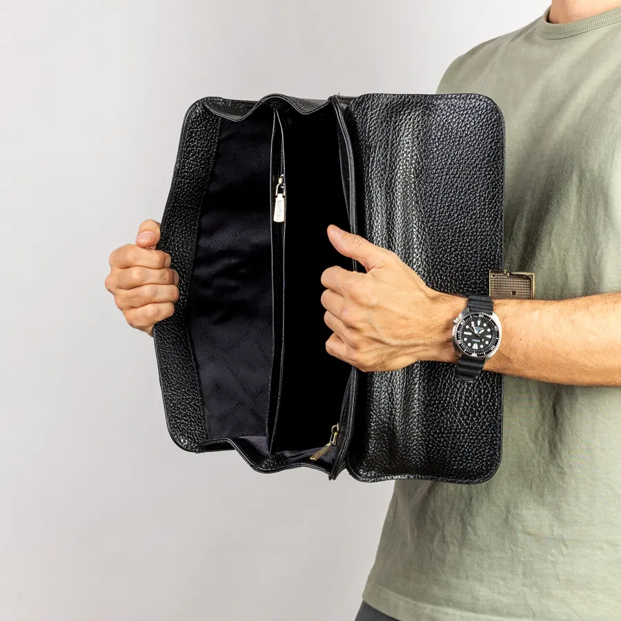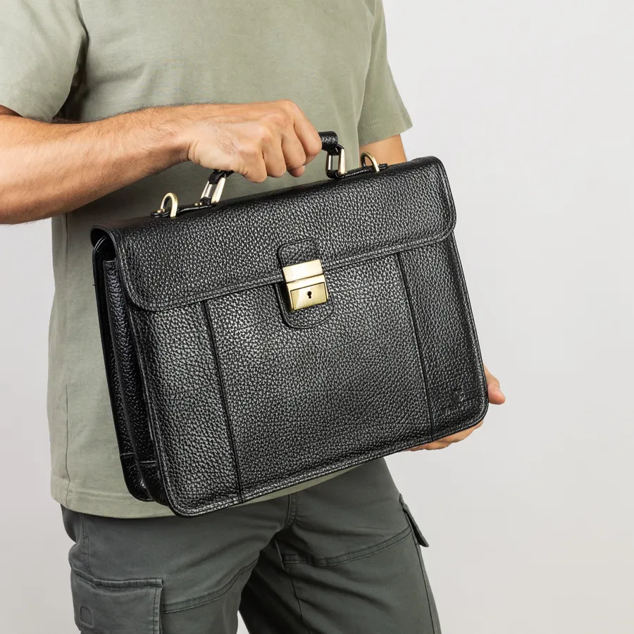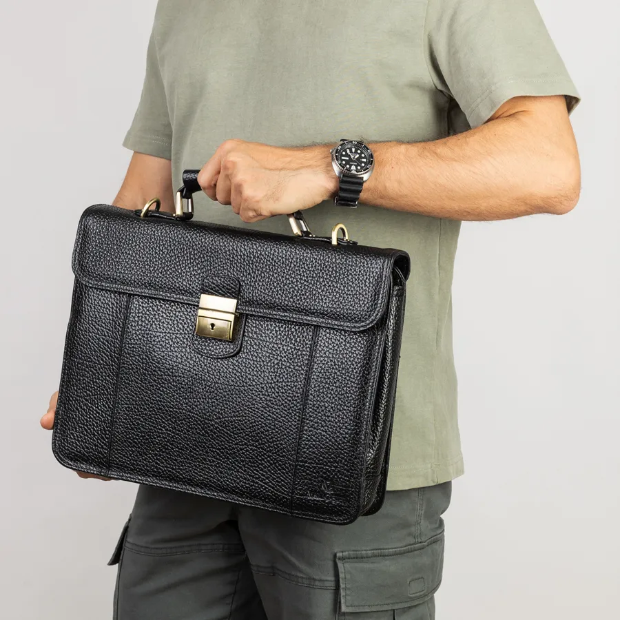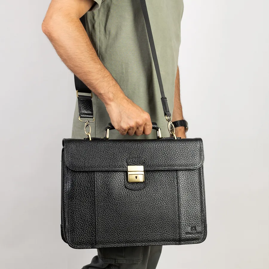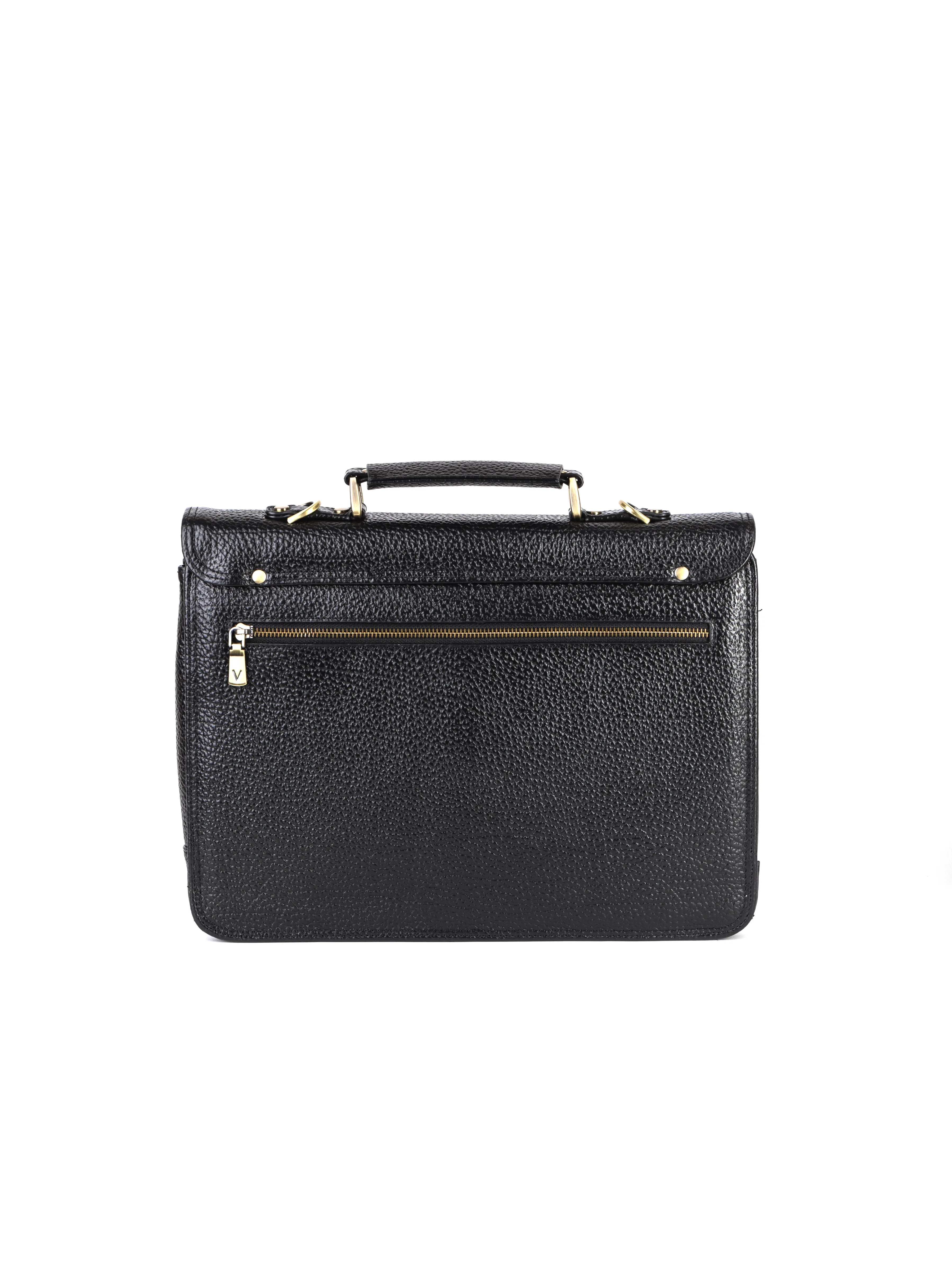Портфель от торговой марки Valigetti из натуральной кожи черного цвета. Практичная функциональная модель с одной ручкой и съемным регулируемым плечевым ремнем с наплечником. Клапан на цупферном замке с замком (в комплекте имеется ключ) закрывает накладной карман и отделение с фирменной подкладкой. В отделении – три отсека, один из которых на молнии; имеется карман на молнии. На задней стороне – карман на молнии. Дно с накладками для защиты от износа.