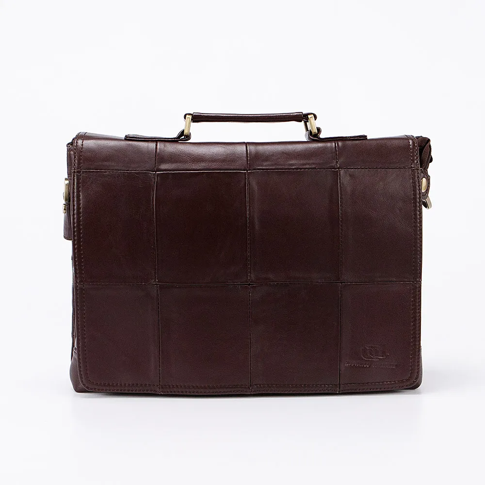 Брутальная деловая мужская сумка от бренда Francesco Molinary выполнена из мягкой и гладкой натуральной кожи в цвете тёмного шоколада. Клапан на двух магнитах и декорирован квадратными вставками, под ним карман на магните и карман на молнии, а также два независимых отделения на молниях, внутри которых средник на молнии и три дополнительных кармана. Снаружи сумка оснащена ручкой и прорезным карманом на молнии, в комплекте есть комбинированный регулируемый плечевой ремень, дополнена золотистой металлической фурнитурой.