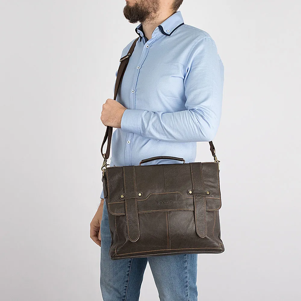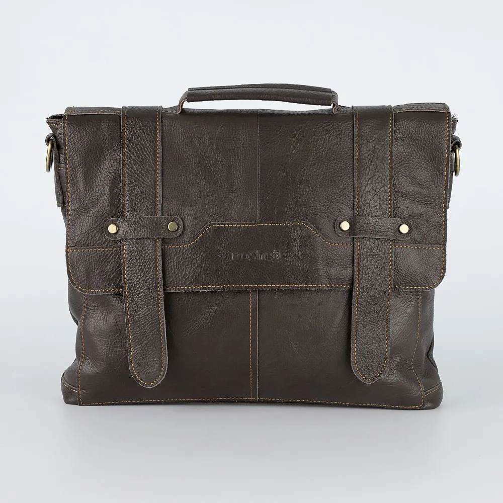 Сумка от торговой марки Poshete из натуральной кожи коричневого цвета с контрастной отстрчокой. Плоская вместительная модель с одной ручкой и съемным регулируемым плечевым ремнем. Закрывается клапаном на двух магнитных кнопках с декоративными ремнями. Отделение на молнии. Внутри: фирменная подкладка, плотные перегородки, карман на молнии, накладной карман. На задней стороне – карман на молнии.